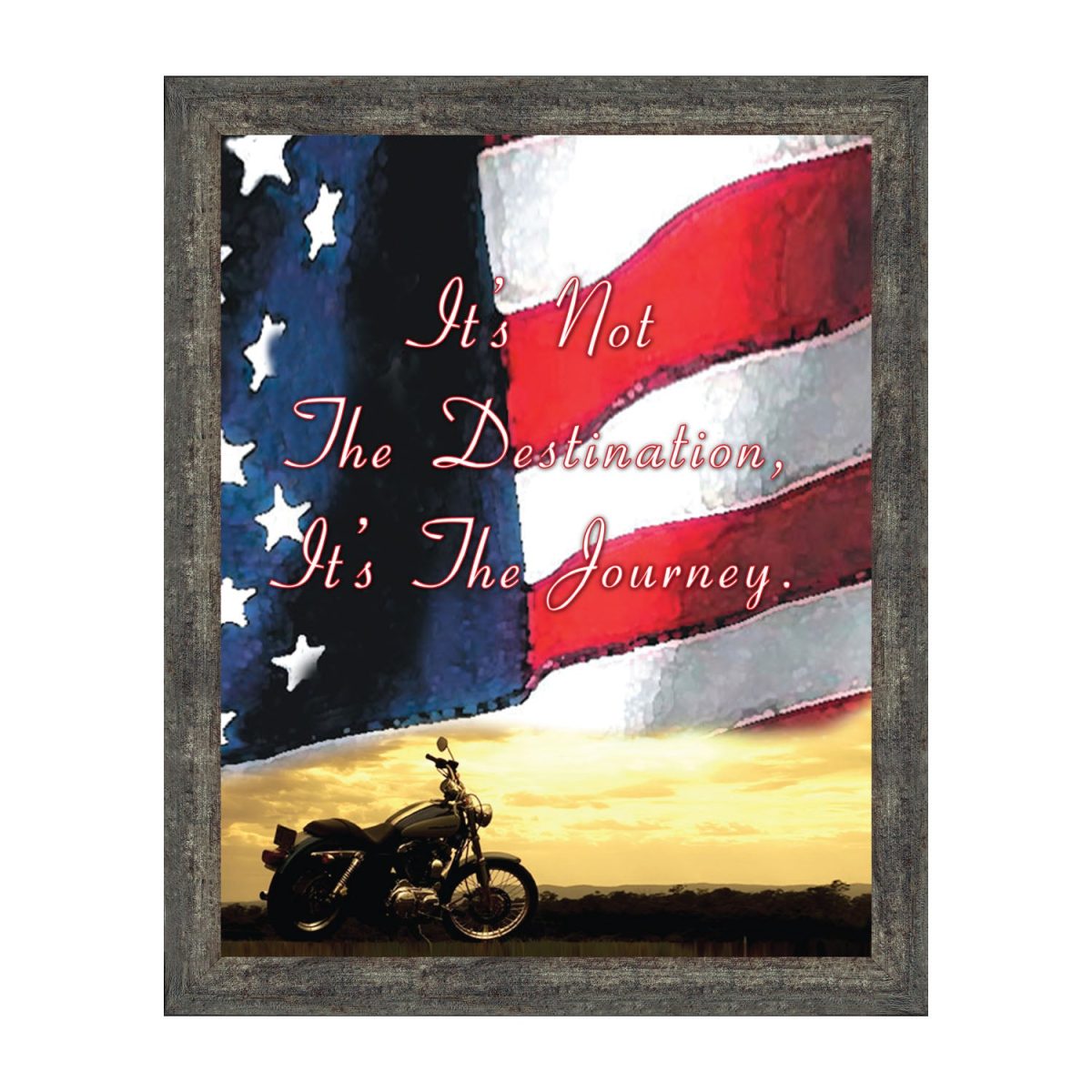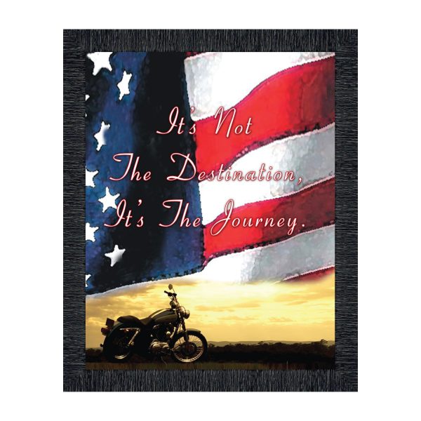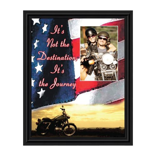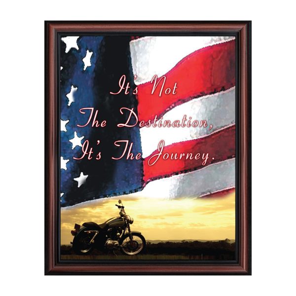 PICTURE FRAMED MOTORCYCLE AMERICAN FLAG SUNSET scene with the saying “It’s Not the Destination, It’s the Journey”. Great gift for the motorcycle enthusiast in your life. Definitely, a unique Harley lover’s gift idea to add to your classic Harley Davidson accessories. This patriotic frame, in your choice of styles, will fit well with any home decor.