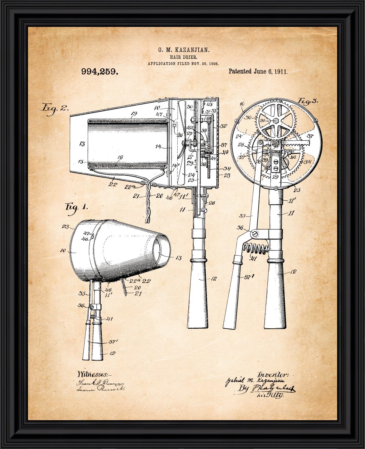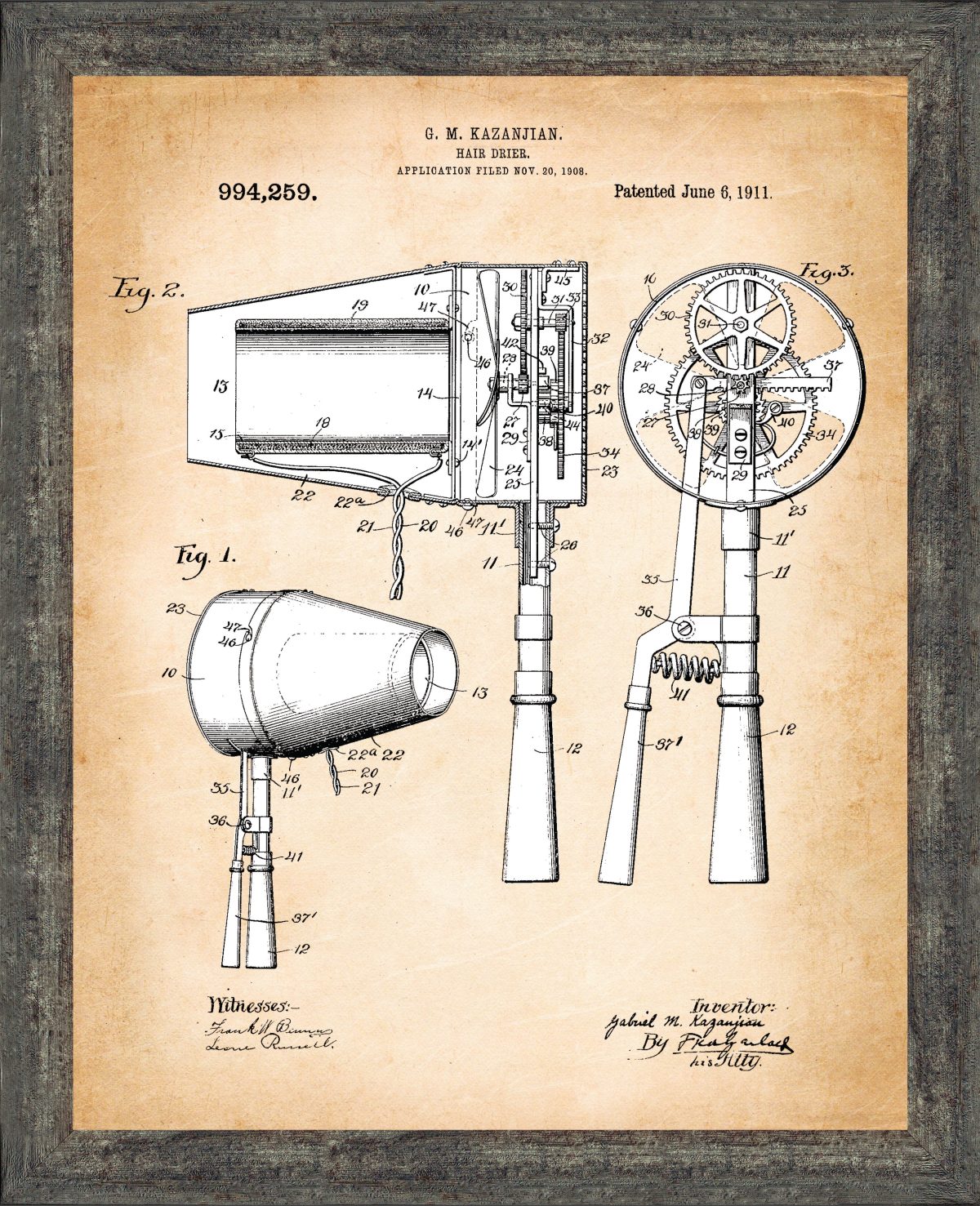 UNIQUE BATHROOM DECOR WALL ART. Display this vintage bathroom picture of patents for hair dryer from the early 1900’s. The framed picture makes an amusing addition to your wall decor.