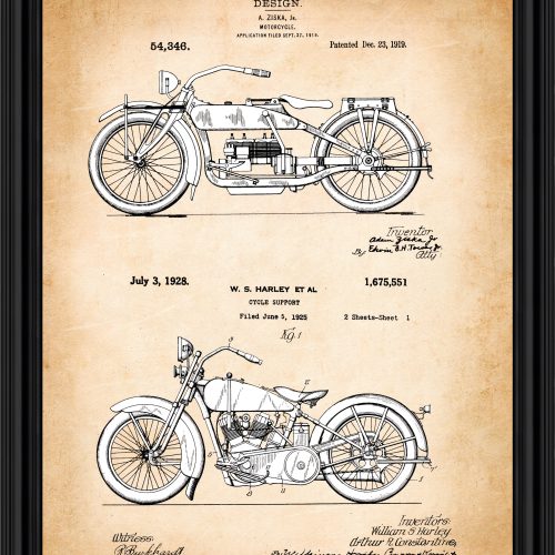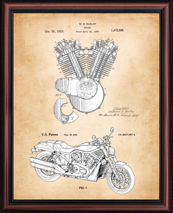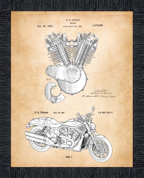 VINTAGE HARLEY DAVIDSON PRINT is a fantastic piece of motorcycle artwork. Print shows a patent print of an engine and a 2006 Harley Davidson motorcycle.