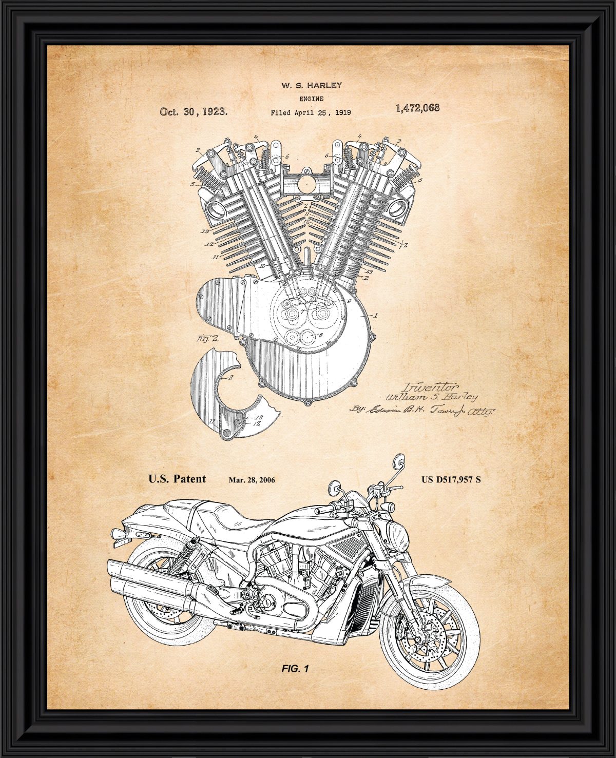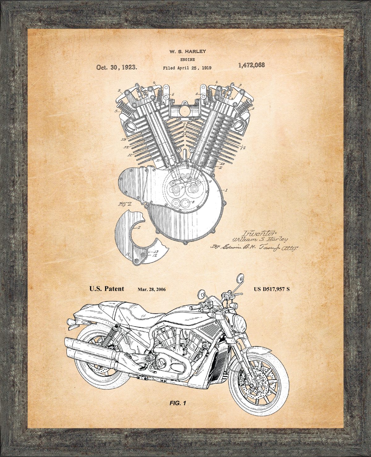 Crossroads Home Decor Harley Davidson Decor Framed Engine and 2006 Framed Motorcycle Patent Print, Unique Harley Davidson Wall Art, Garage Decor, Motorcycle Gifts for Men