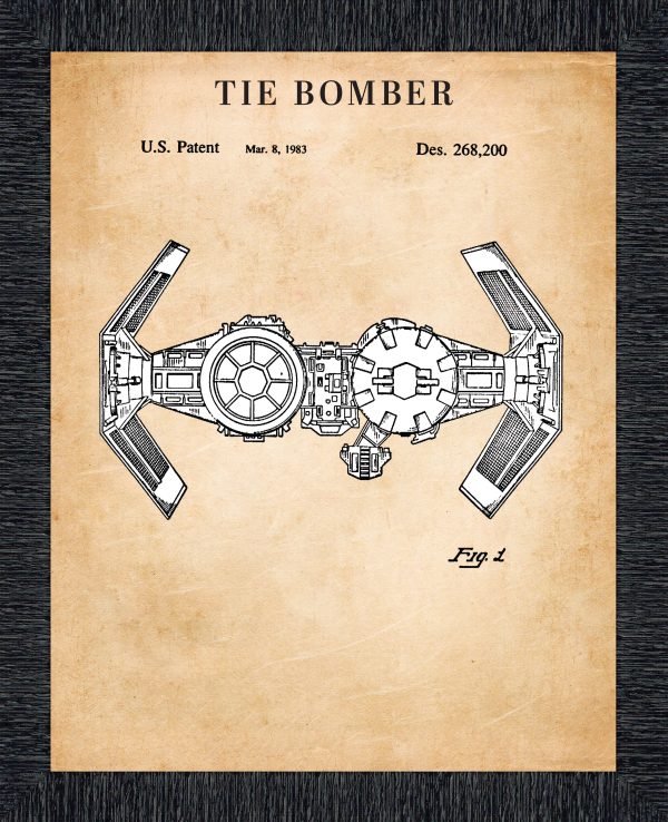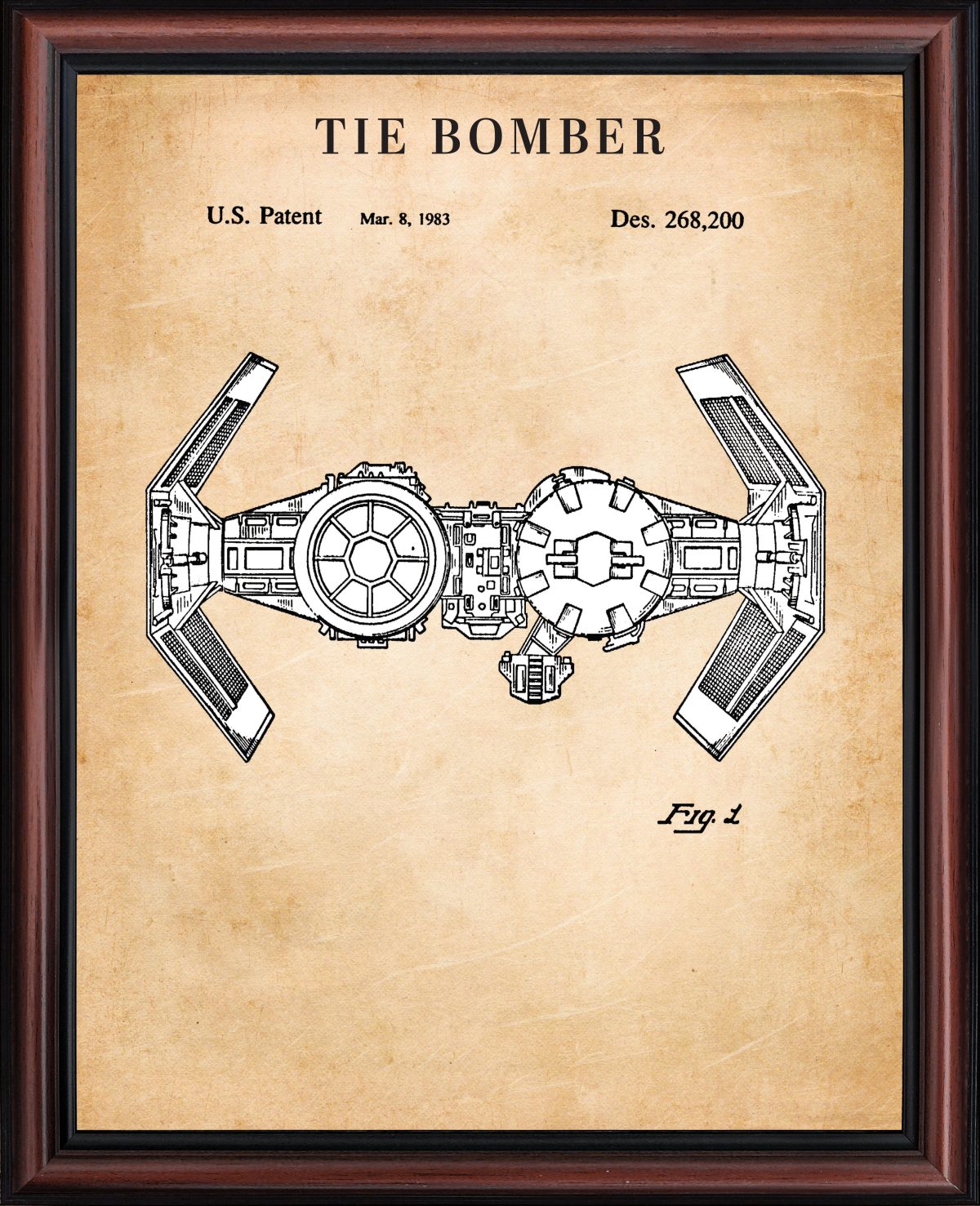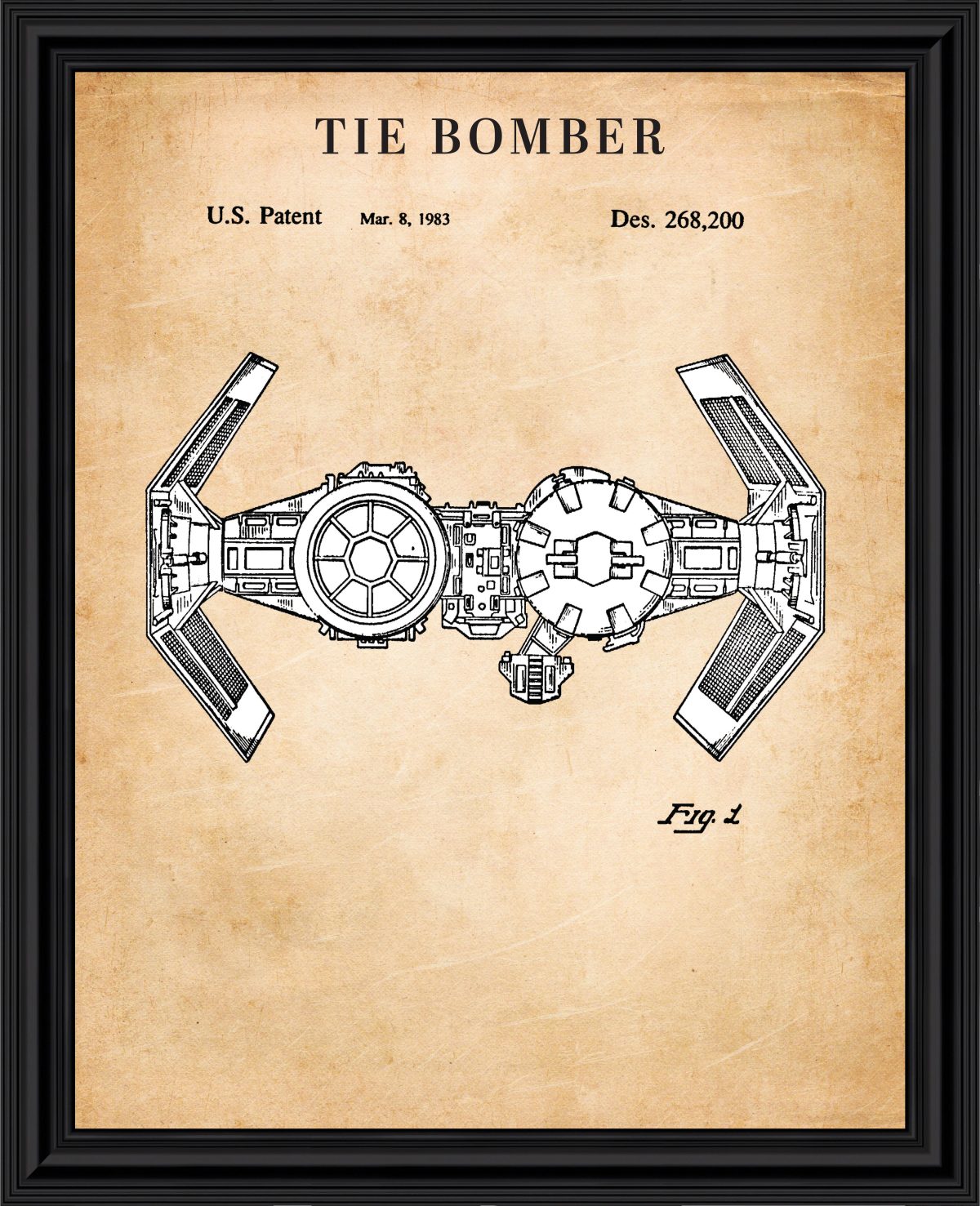 PATENT PRINT OF TIE BOMBER MODEL, the back bone of the Imperial Star Wars vehicles will make a great display for you living room bedroom, man cave or office decor. Birthday or Christmas gift idea for the Star Wars Collector.
