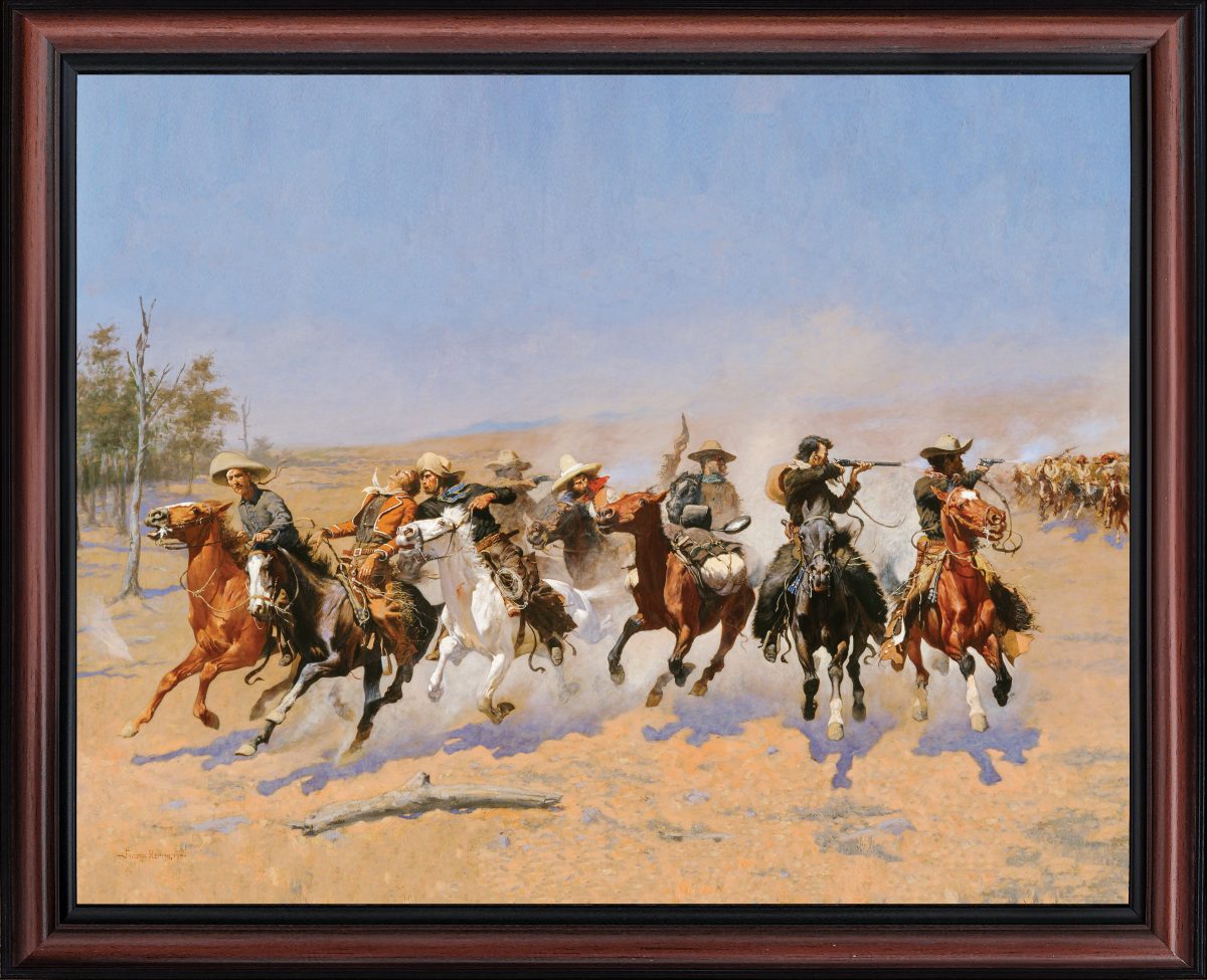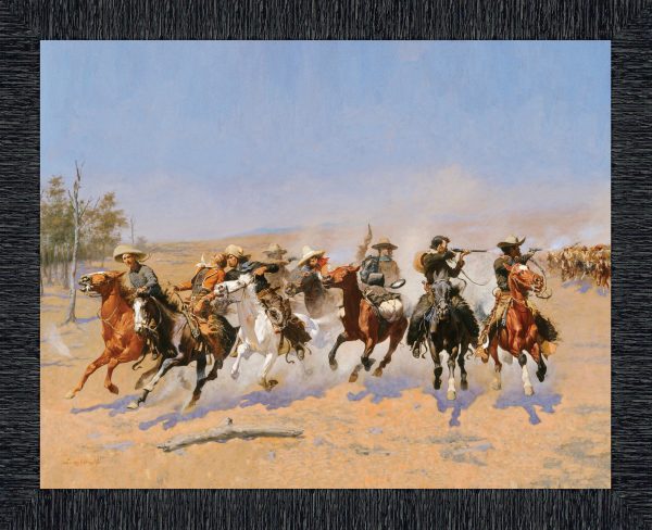DASH TO THE TIMBERS is a classic of old west paintings. This framed art piece would be a wonderful addition to your living room, den, or man cave decor.