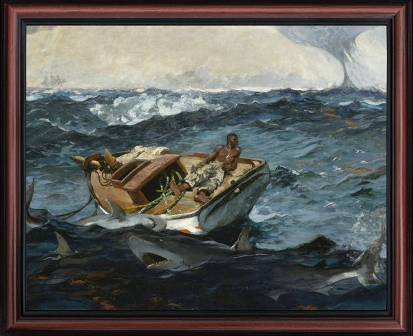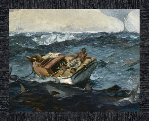 THE GULF STREAM shows a sailor in a small fishing boat struggling against the waves of the sea, The ship’s sail mast has broken off and sharks are in the waters around the boat. It is a very dramatic painting about the power and dangers of the sea.
