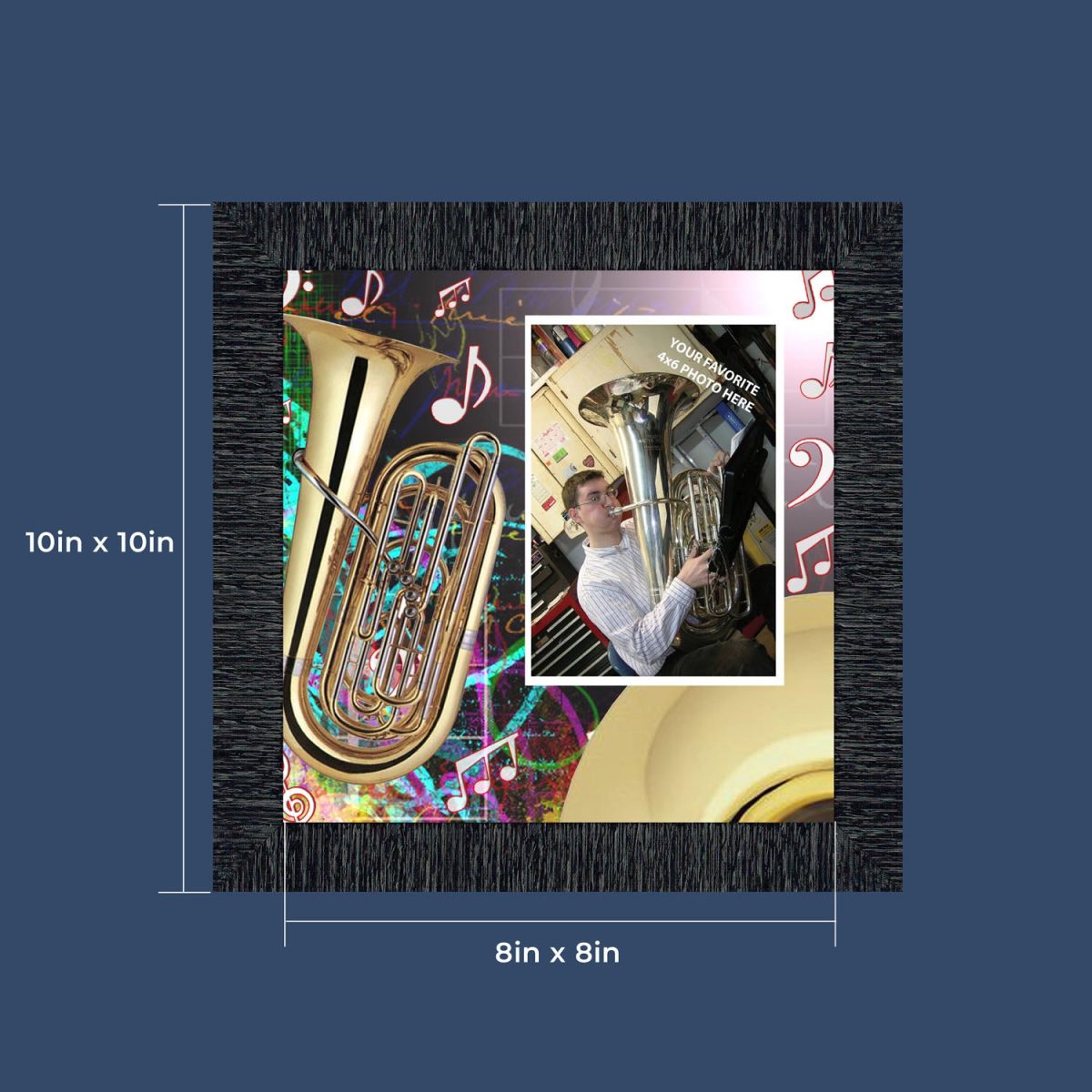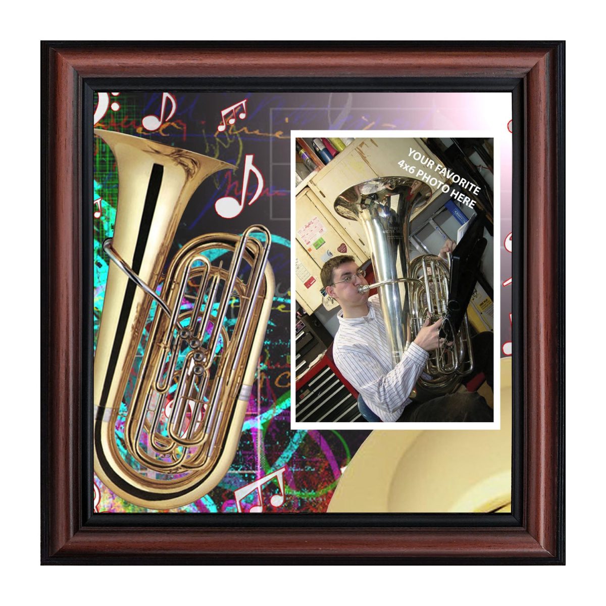- Picture framed tuba with colorful background and music notes