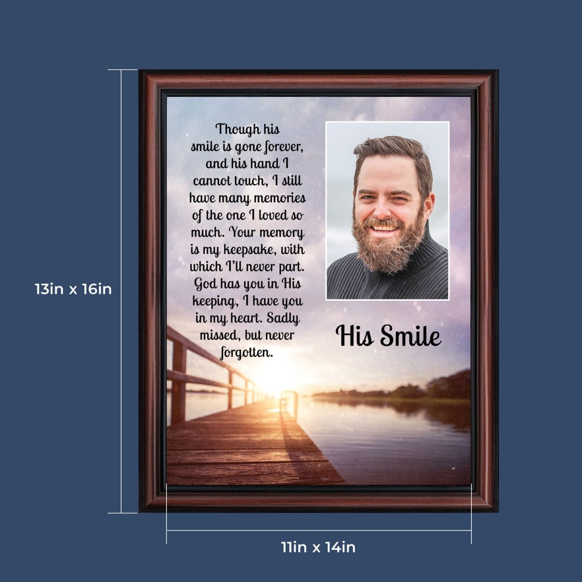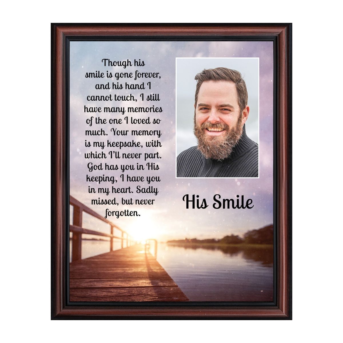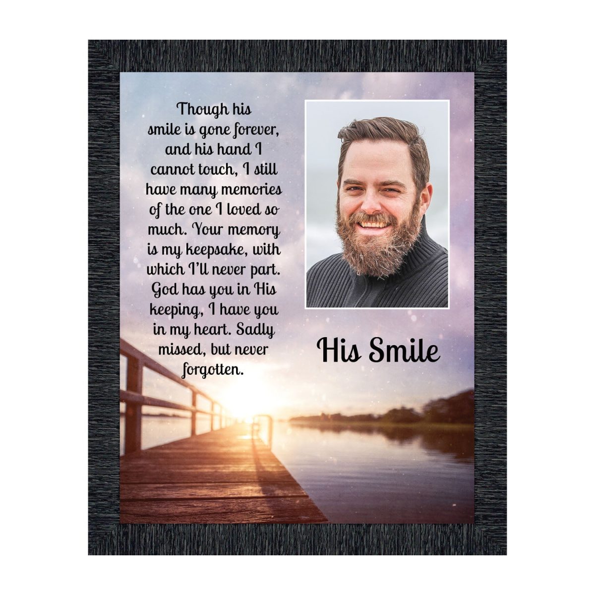 THIS MEN’S “HIS SMILE” SYMPATHY GIFT is crafted for those who are grieving the loss of a husband, father, grandfather, son, or male friend. See our “HER SMILE” sympathy gifts that honor a wife, mother, grandma, or daughter or a female friend. Each frame will capture the smile and spirit of the loved one who has passed away.