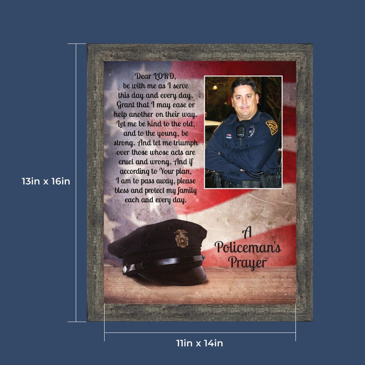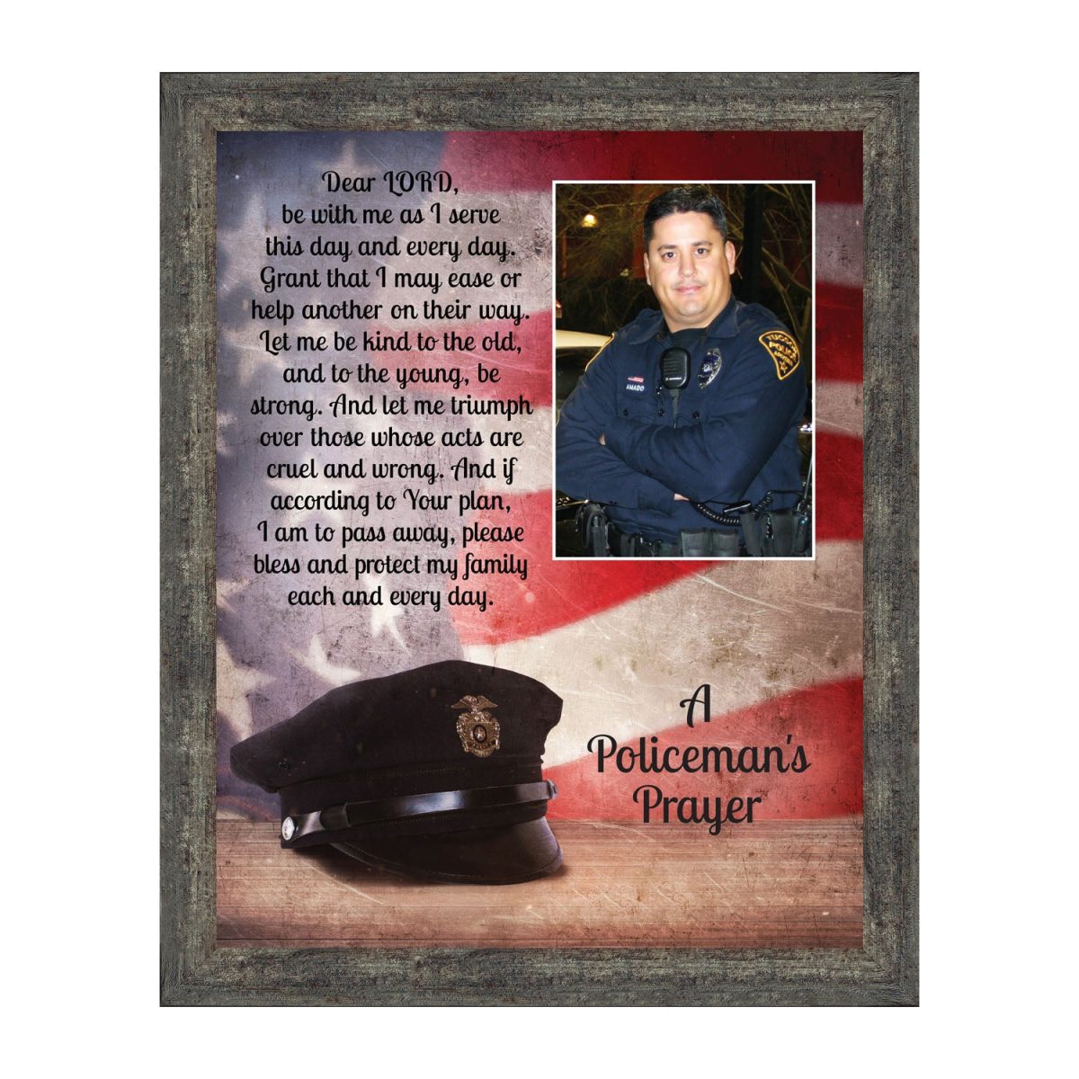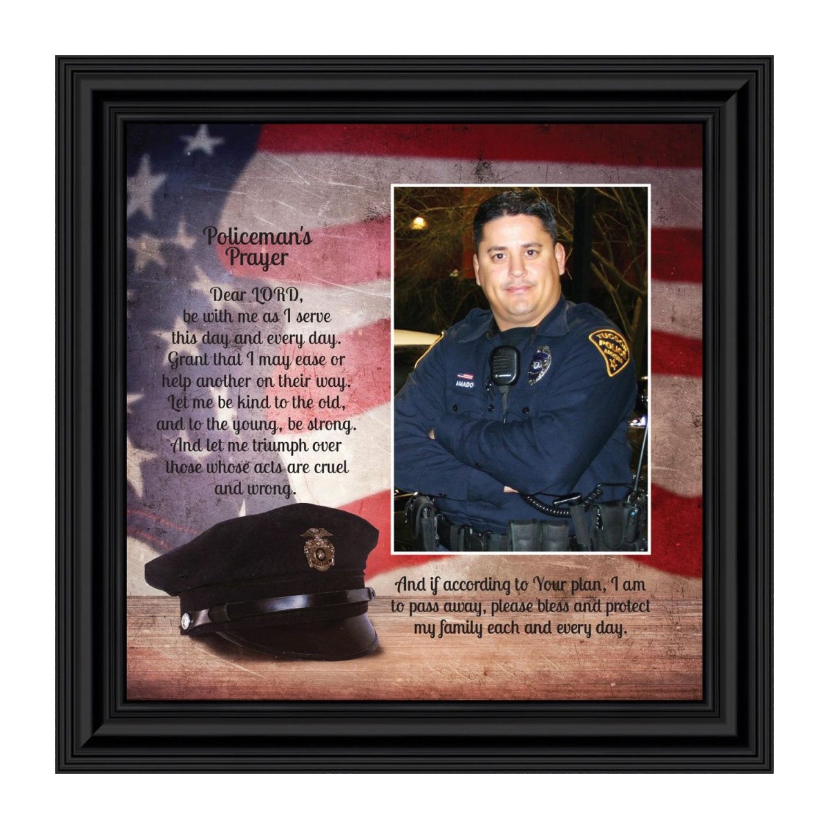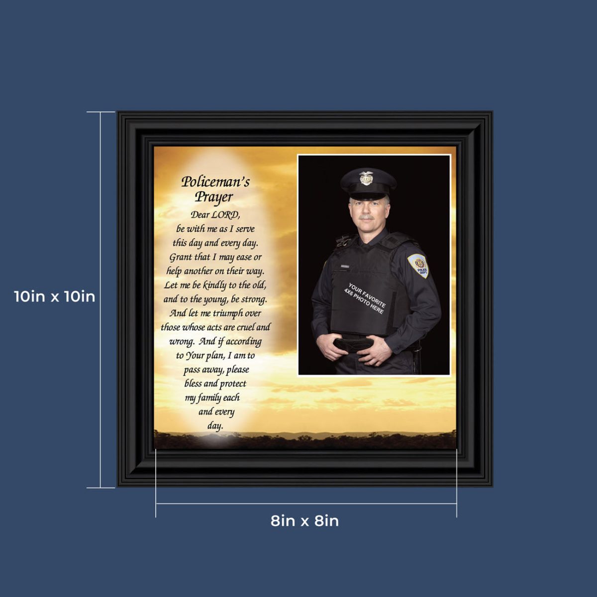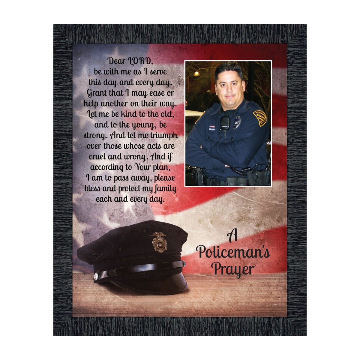 “THE POLICE OFFICER’S PRAYER” picture frame is a unique and meaningful gift for an officer in training or a gift for a police academy graduate. Use as part of your academy graduation party decorations and then enjoy for years to come to remember the occasion. Also, use the frame to celebrate the time-honored swearing-in and oath-taking ceremony.