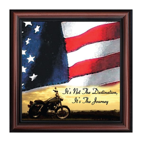 PICTURE FRAMED MOTORCYCLE AMERICAN FLAG SUNSET scene with the saying “It’s Not the Destination, It’s the Journey”. Great gift for the motorcycle enthusiast in your life. Definitely, a unique Harley lover’s gift idea to add to your classic Harley Davidson accessories. This patriotic frame, in your choice of styles, will fit well with any home decor.