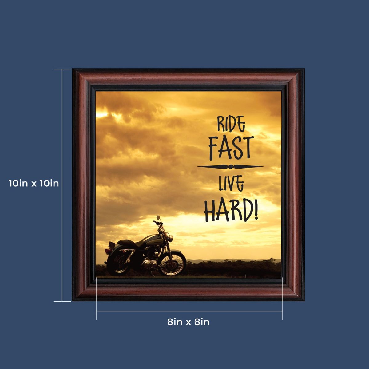 - Picture framed motorcycle sunset scene with the saying “Ride Fast, Live Hard”