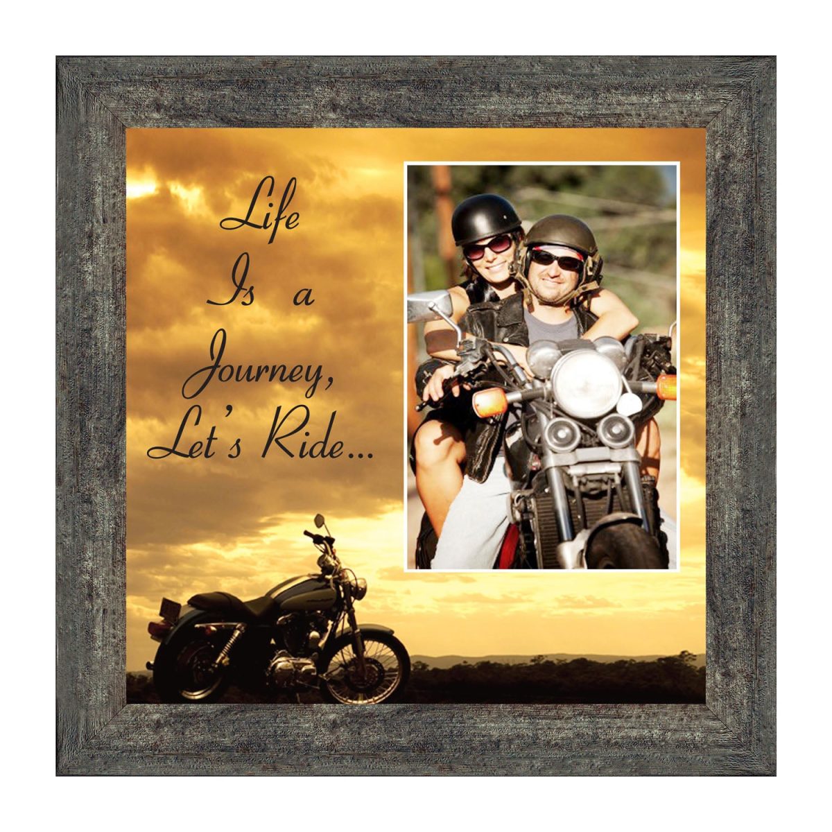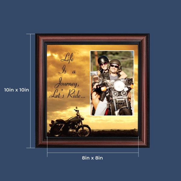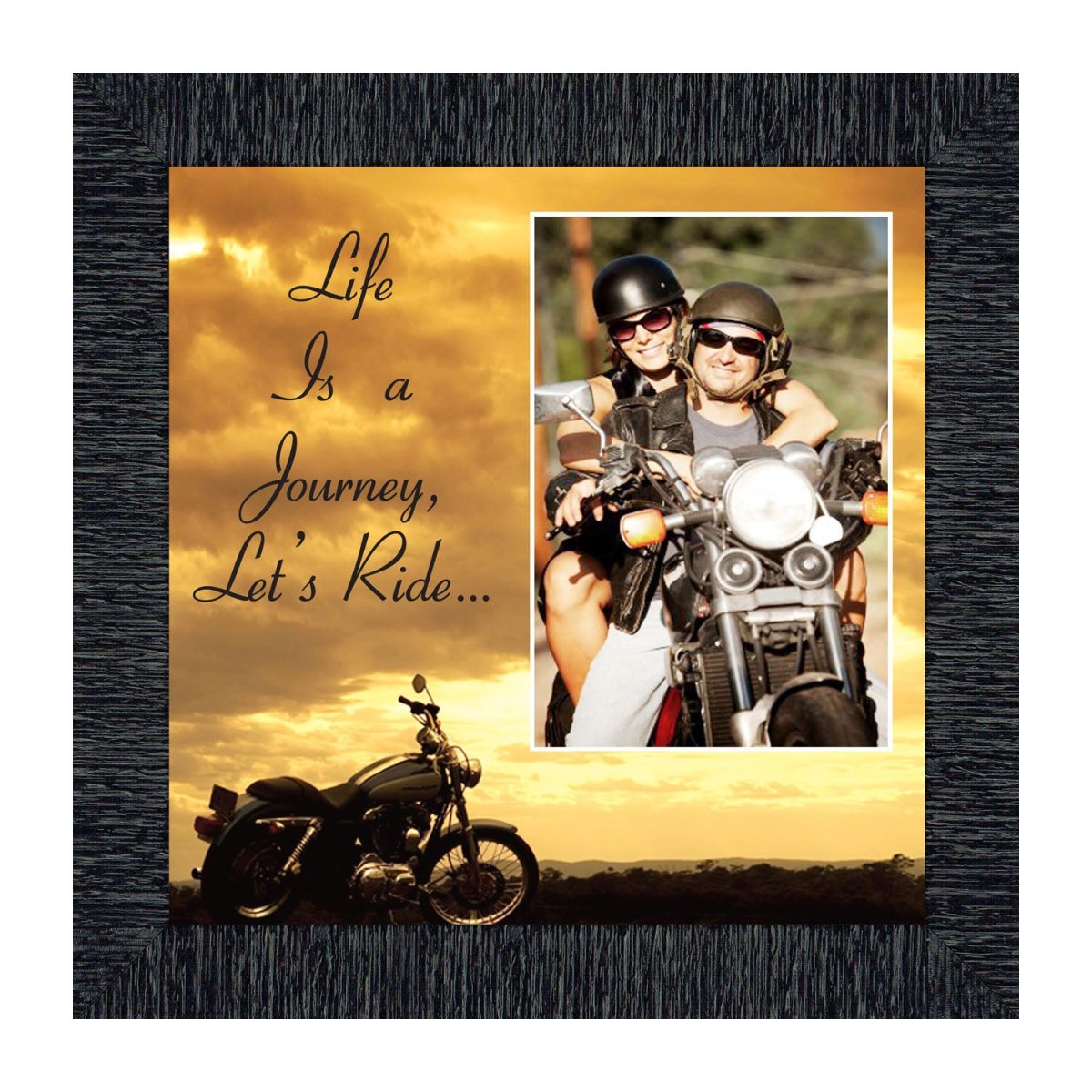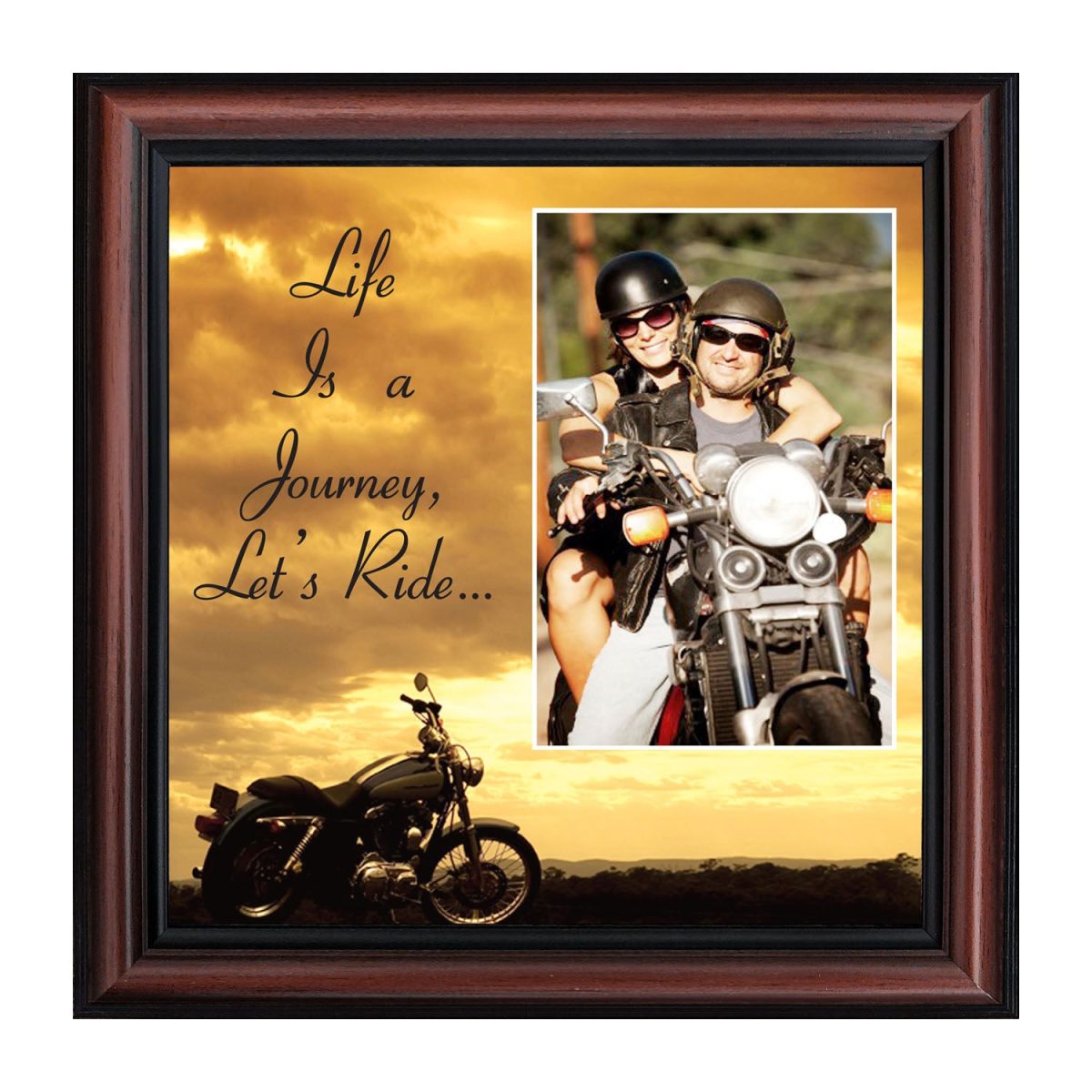 PICTURE FRAMED MOTORCYCLE SUNSETscene with the saying “Life is a Journey, Let’s Ride”. Great gift for the motorcycle enthusiast in your life. Definitely a unique Harley lover’s gift idea to add to your Harley Davidson accessories. This frame, in your choice of styles, will fit well with any home decor.”
