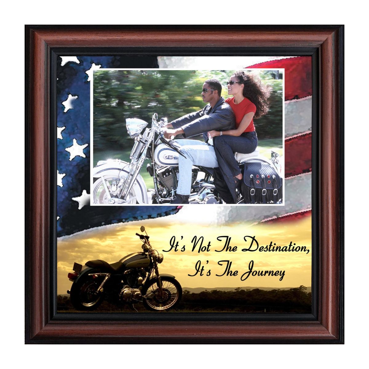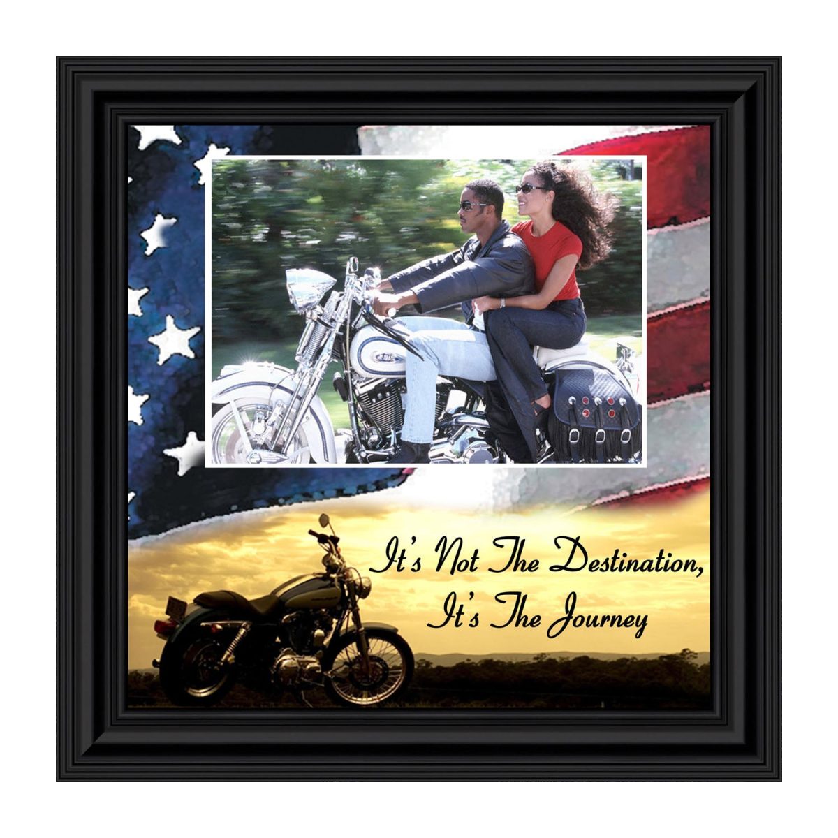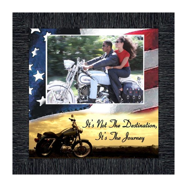 PICTURE FRAMED MOTORCYCLE AMERICAN FLAG SUNSET scene with the saying “It’s Not the Destination, It’s the Journey”. Great gift for the motorcycle enthusiast in your life. Definitely, a unique Harley lover’s gift idea to add to your classic Harley Davidson accessories. This patriotic frame, in your choice of styles, will fit well with any home decor.