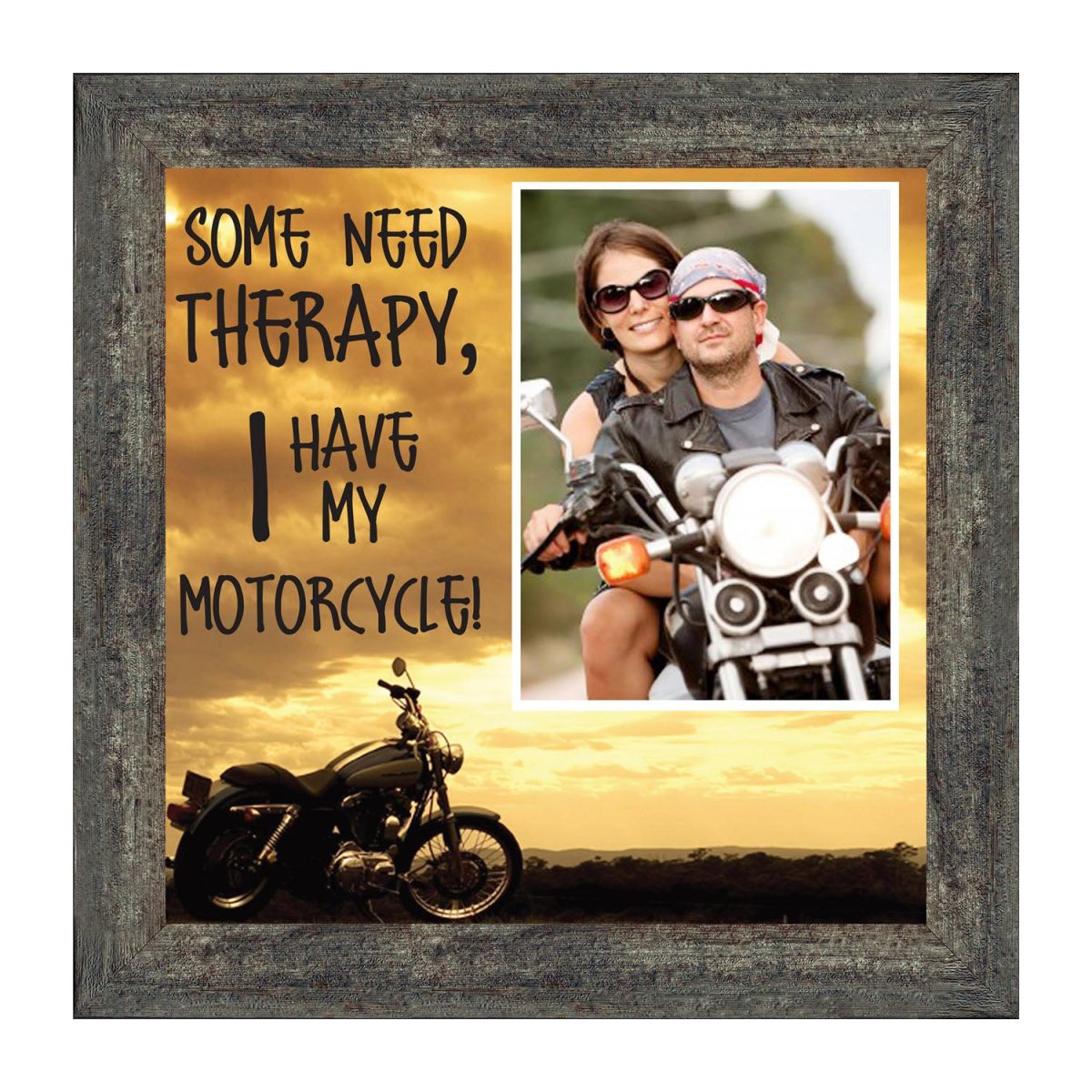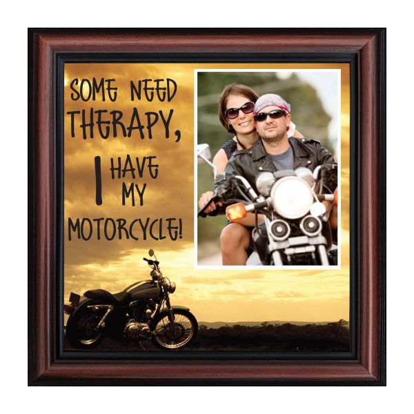 - Picture framed motorcycle sunset scene with the saying “Some Need Therapy, I Have My Motorcycle”