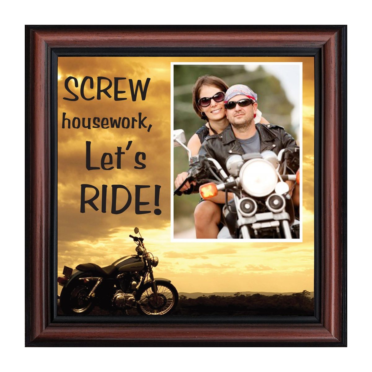 - Picture framed motorcycle sunset scene with the saying “Screw Housework, Let’s Ride!”