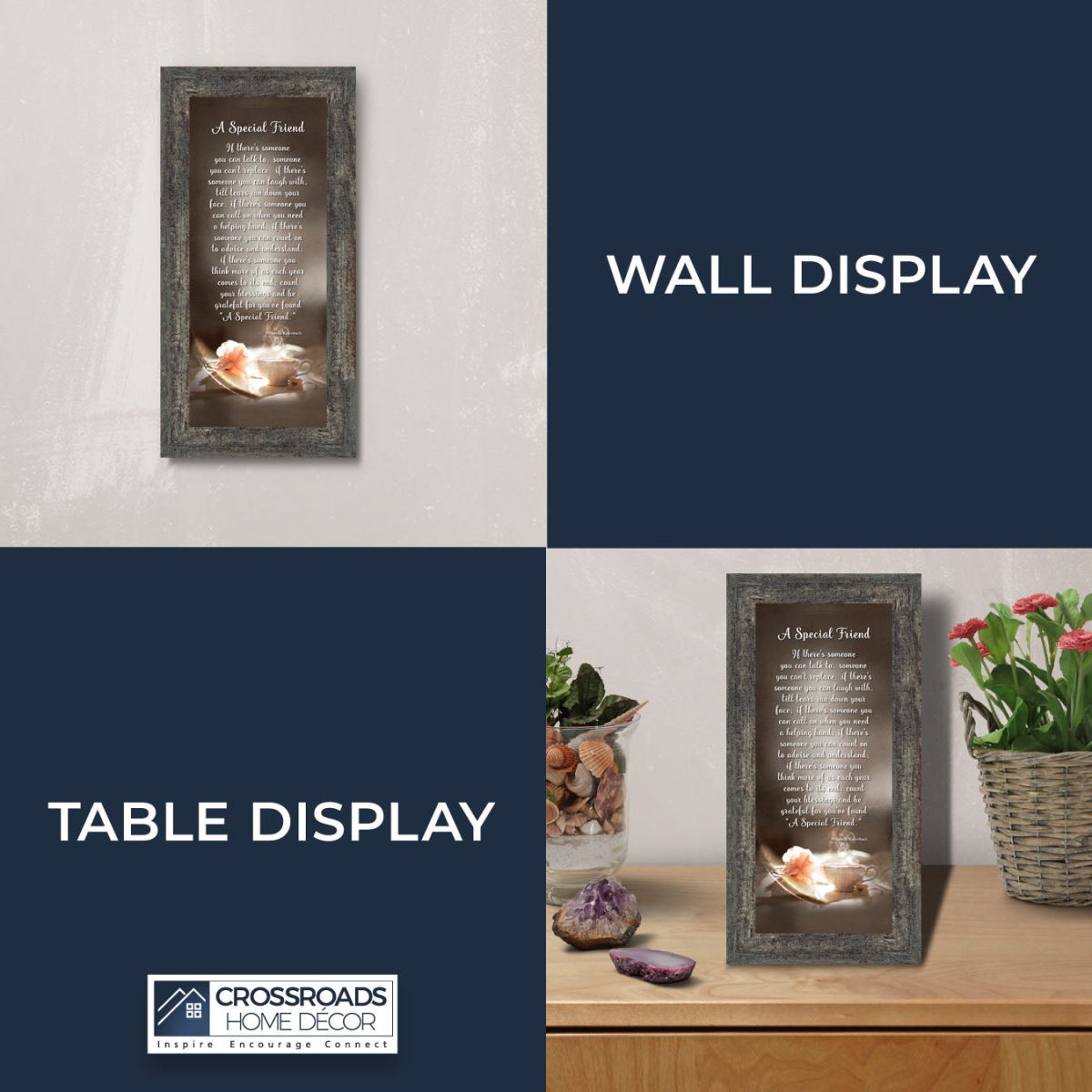 INSPIRE, ENCOURAGE and CONNECT with people to show you care. This inspirational work of art will give all who see it as an encouraging word for the day. Each frame is carefully packed and shipped to you or whomever you choose to ship it to. Every frame has an easel back that makes for a quick easy display (except for the 11″x14″) or a wall hanger for a more permanent decor solution. The front is real glass and will protect the print inside from fingerprints and dust. This beautiful, encouraging work of art will be cherished by your loved one for a lifetime.