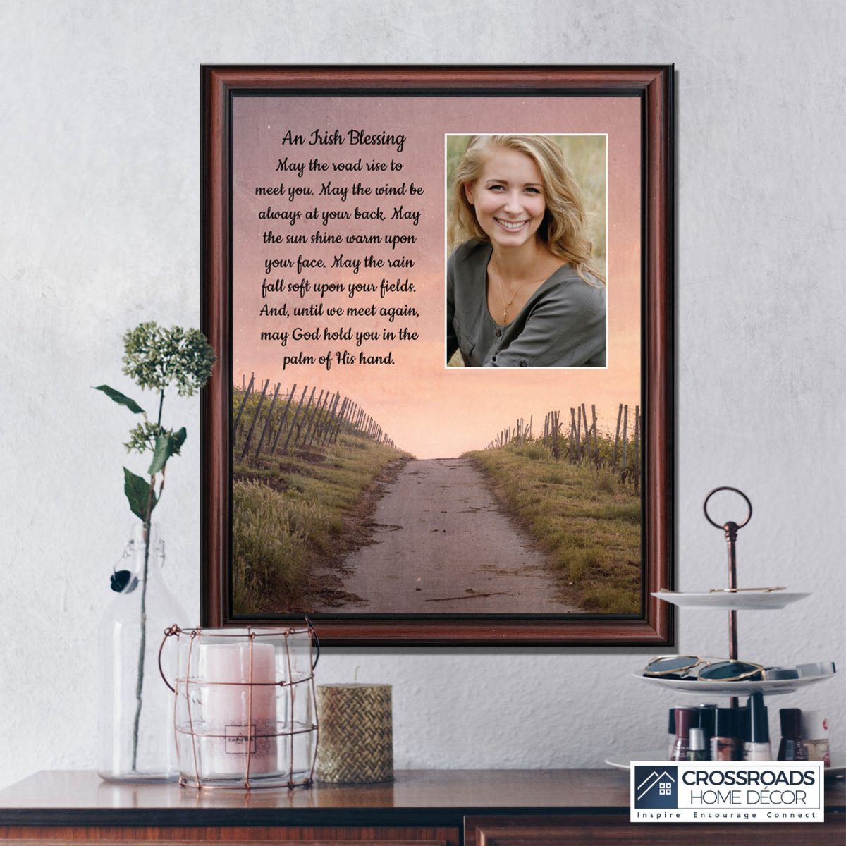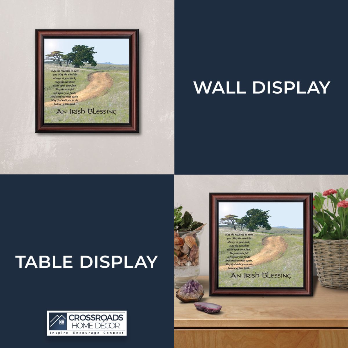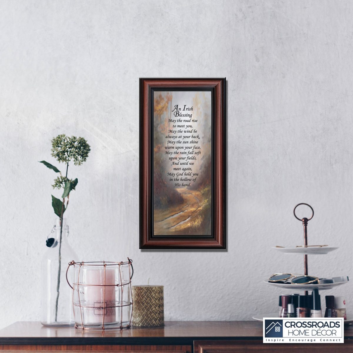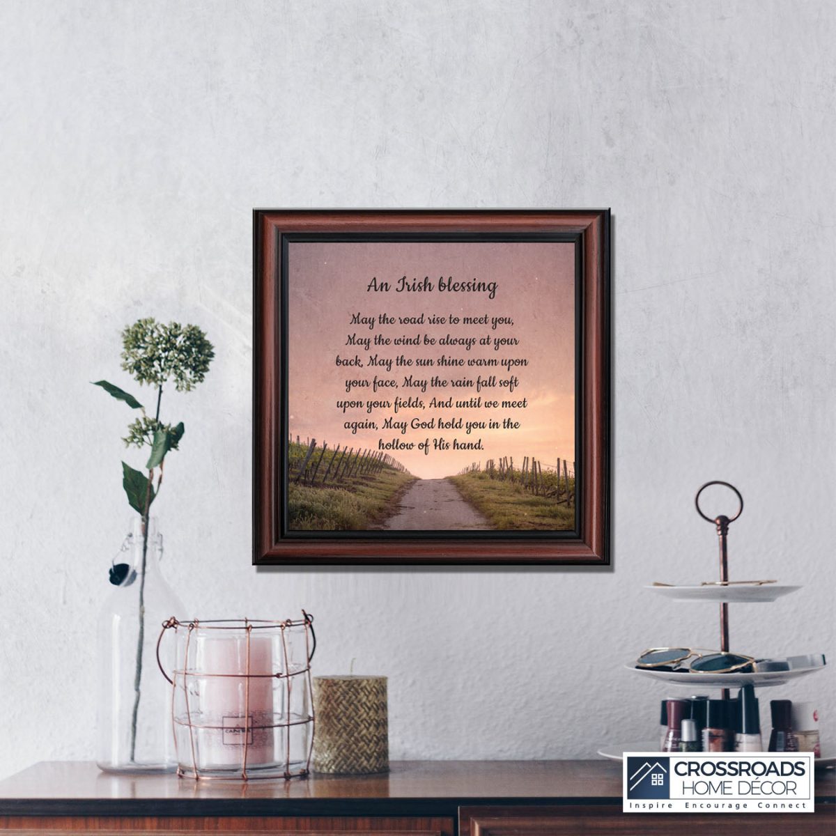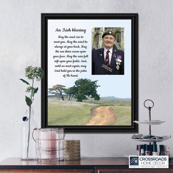 THE IRISH BLESSINGis a traditional Celtic poem passed down through the generations. The words portray the beauty of nature, wind, sun, and rain, to form the classic words of good wishes. It can be used for a wedding prayer or gift, home blessing for a new home gift, to say a sympathetic goodbye to a loved one, or a going-away present. This Irish decor can be used for any celebration as beautiful Christian home decor.