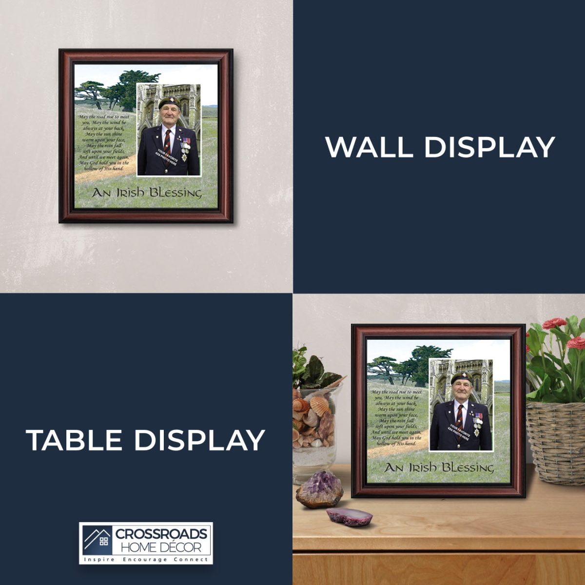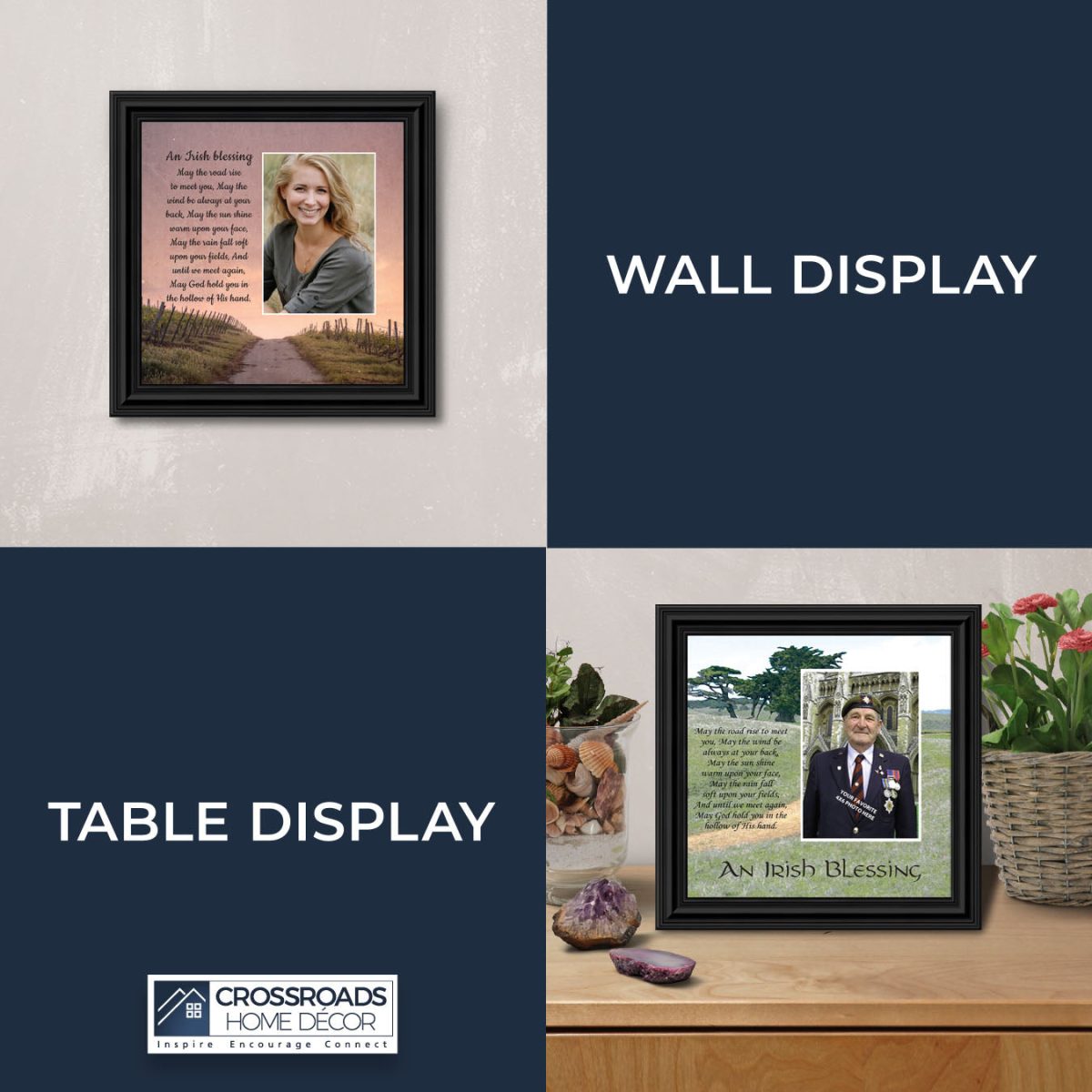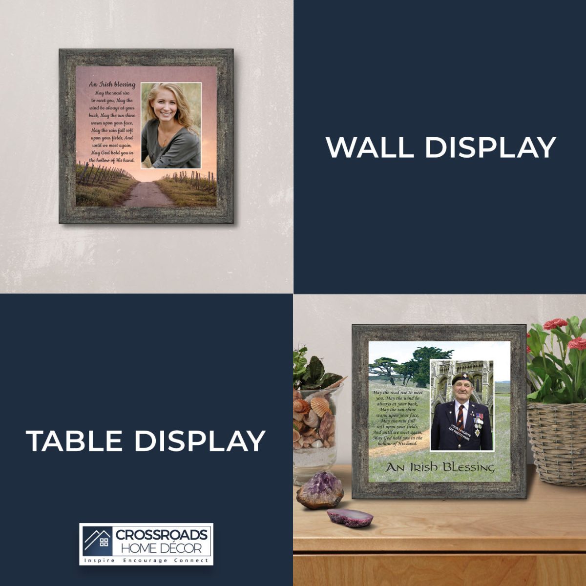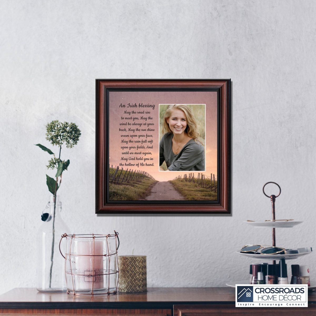 THE IRISH BLESSINGis a traditional Celtic poem passed down through the generations. The words portray the beauty of nature, wind, sun, and rain, to form the classic words of good wishes. It can be used for a wedding prayer or gift, home blessing for a new home gift, to say a sympathetic goodbye to a loved one, or a going-away present. This Irish decor can be used for any celebration as beautiful Christian home decor.