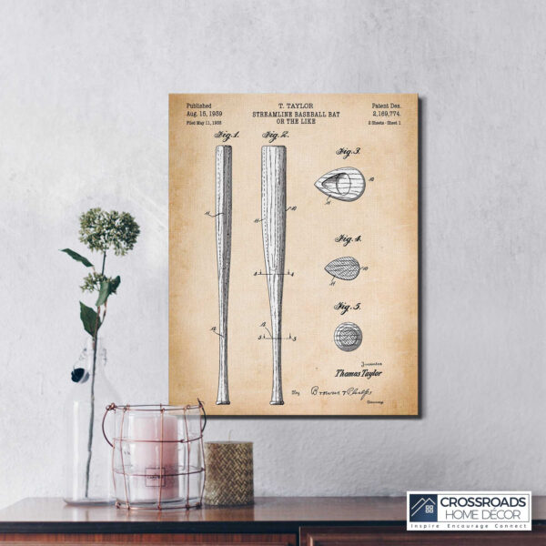Crossroads Home Décor, Baseball Bedroom Decor, Baseball Bat Patent Canvas Print, Ready To Hang for Living Room Home Wall Decor