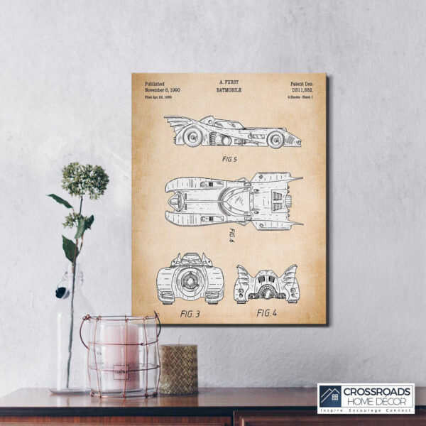 Crossroads Home Decor Batman Gifts for Men, batman Decor, Batmobile Patent Canvas Print , Ready To Hang for Living Room Home Wall Decor