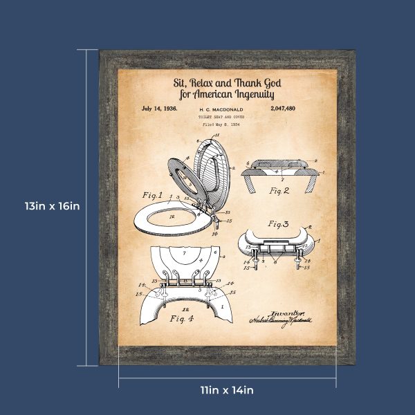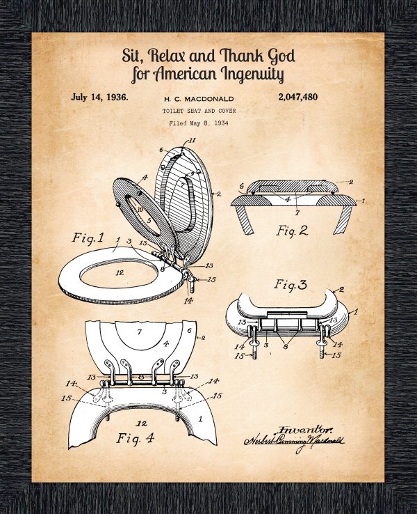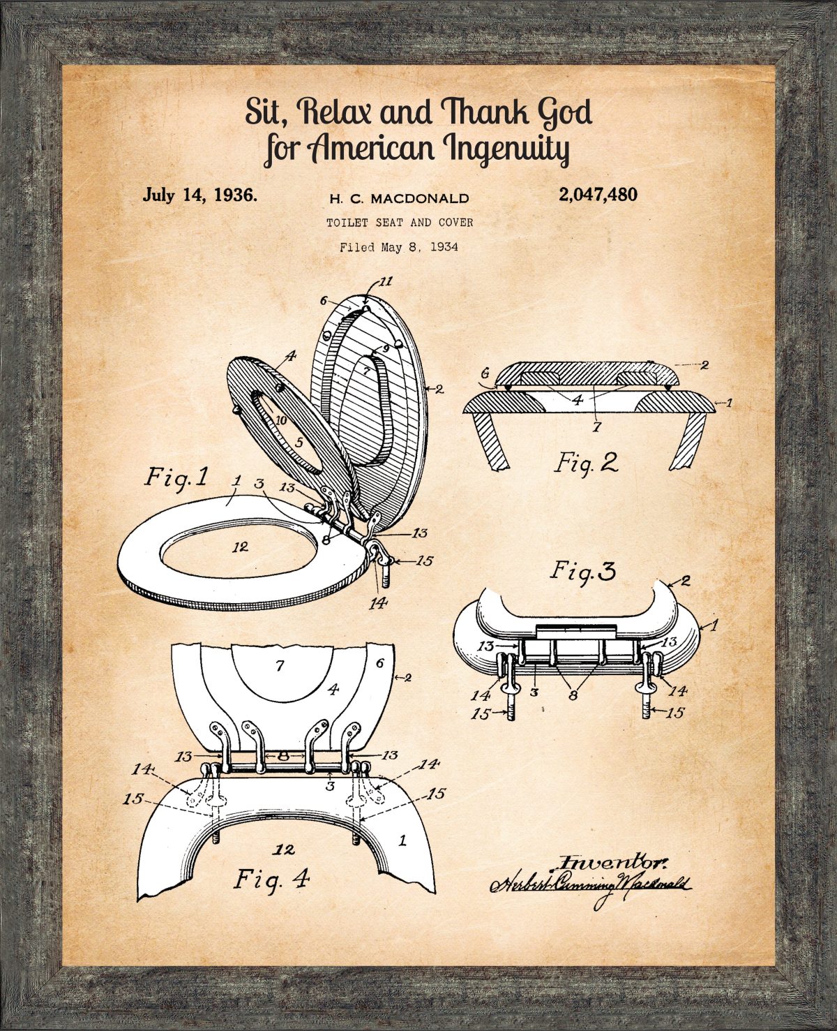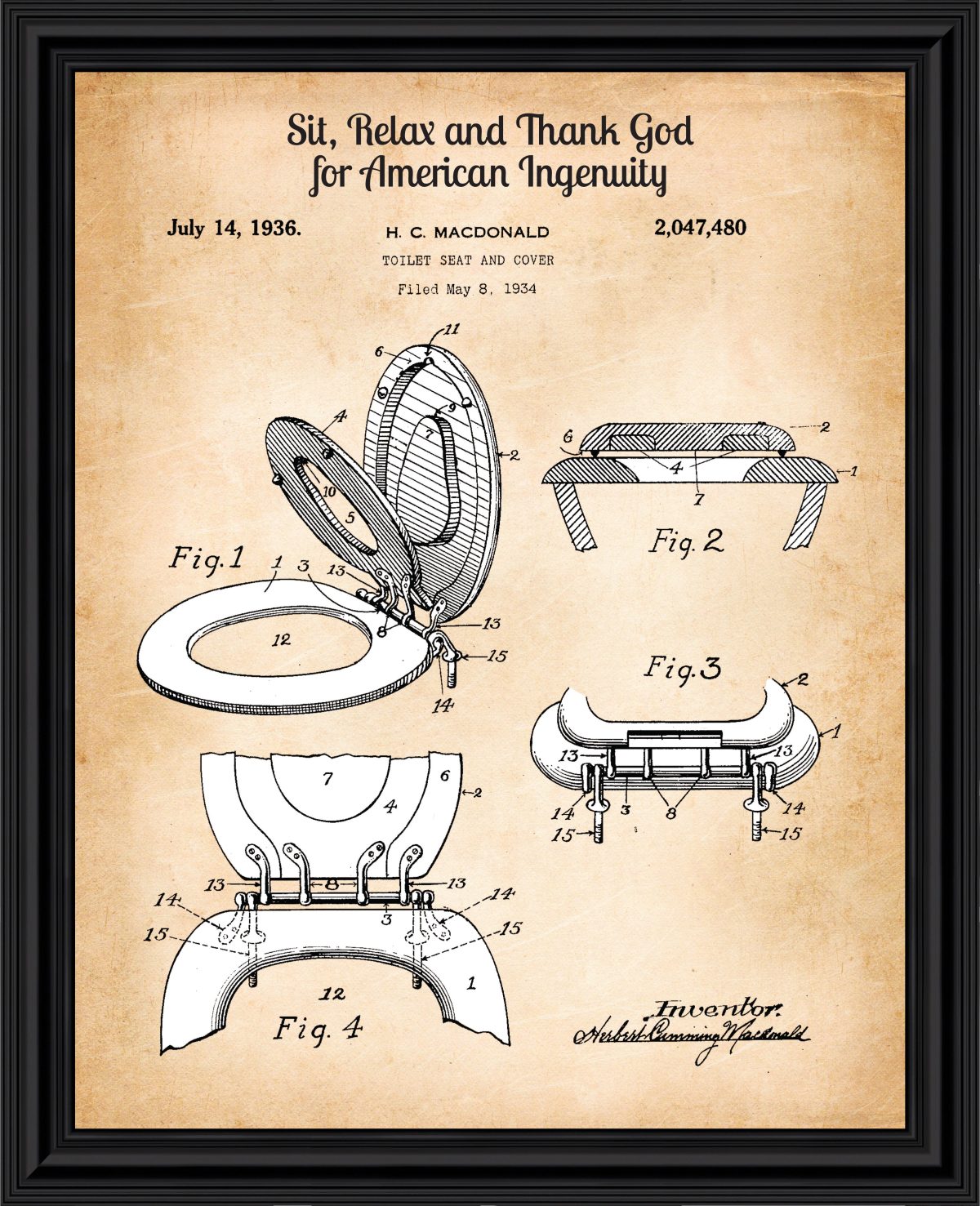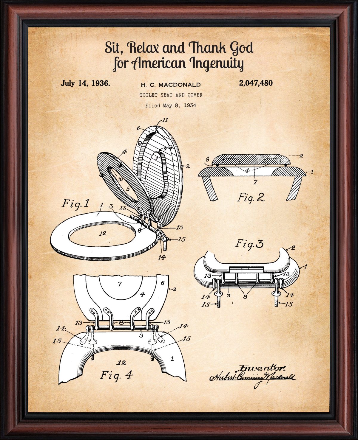 UNIQUE BATHROOM DECOR WALL ART. Display this vintage bathroom picture of patents for toilet seat. The framed picture makes an amusing addition to your wall decor.