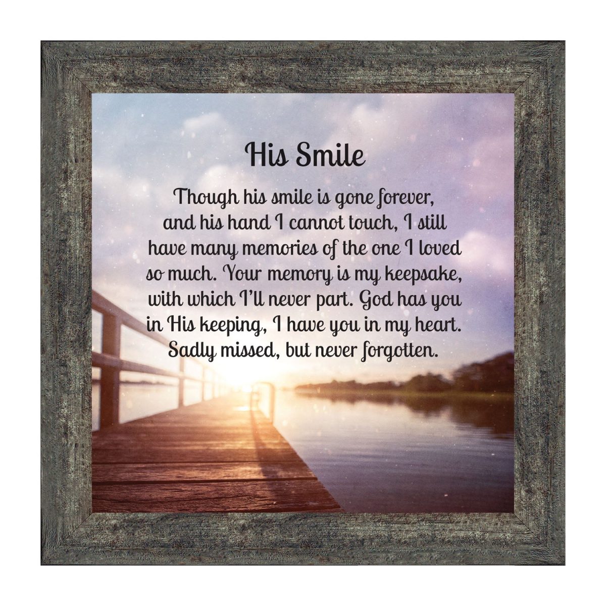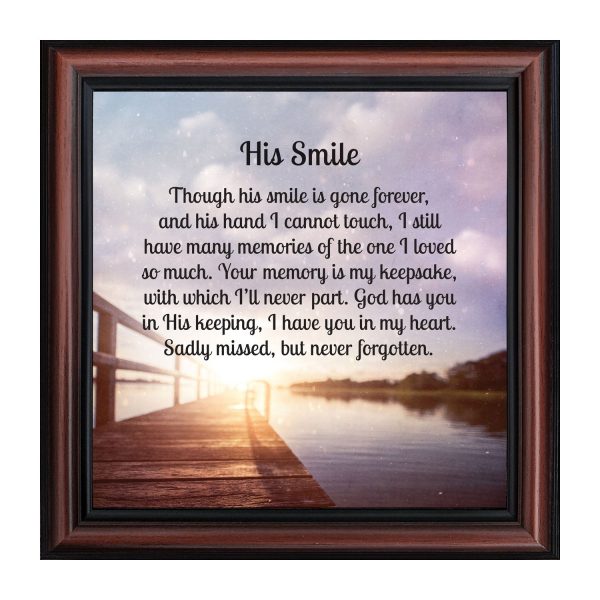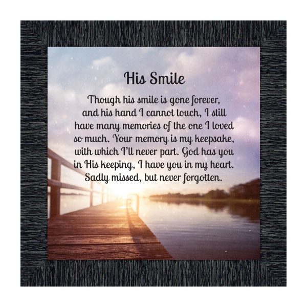 THIS MEN’S “HIS SMILE” SYMPATHY GIFT is crafted for those who are grieving the loss of a husband, father, grandfather, son, or male friend. See our “HER SMILE” sympathy gifts that honor a wife, mother, grandma, or daughter or a female friend. Each frame will capture the smile and spirit of the loved one who has passed away.