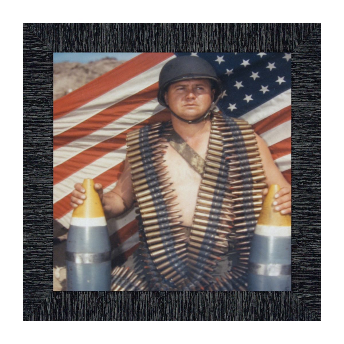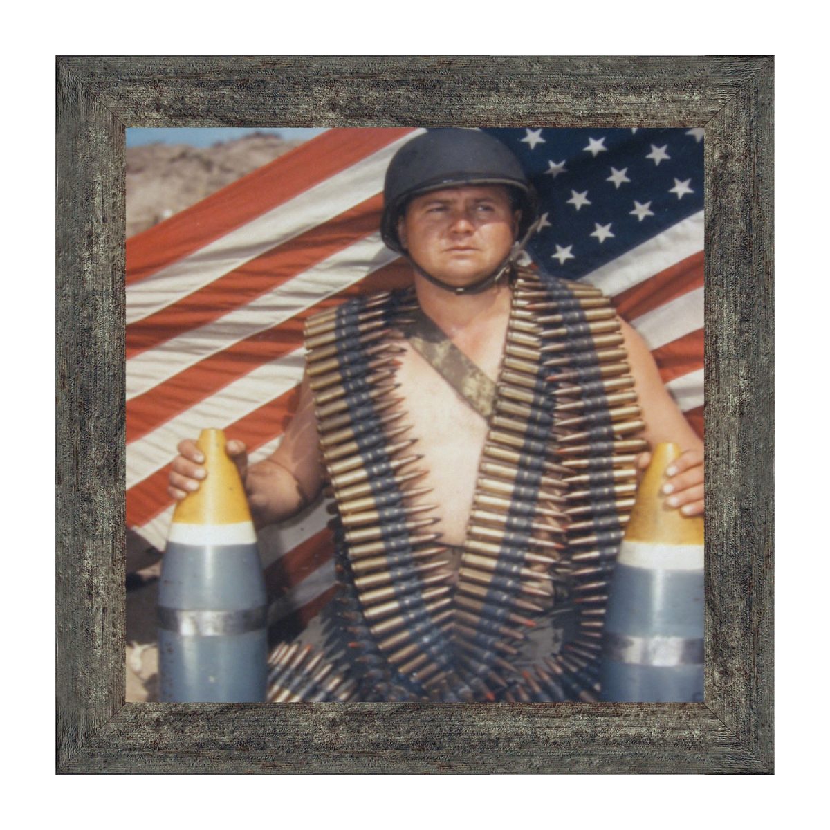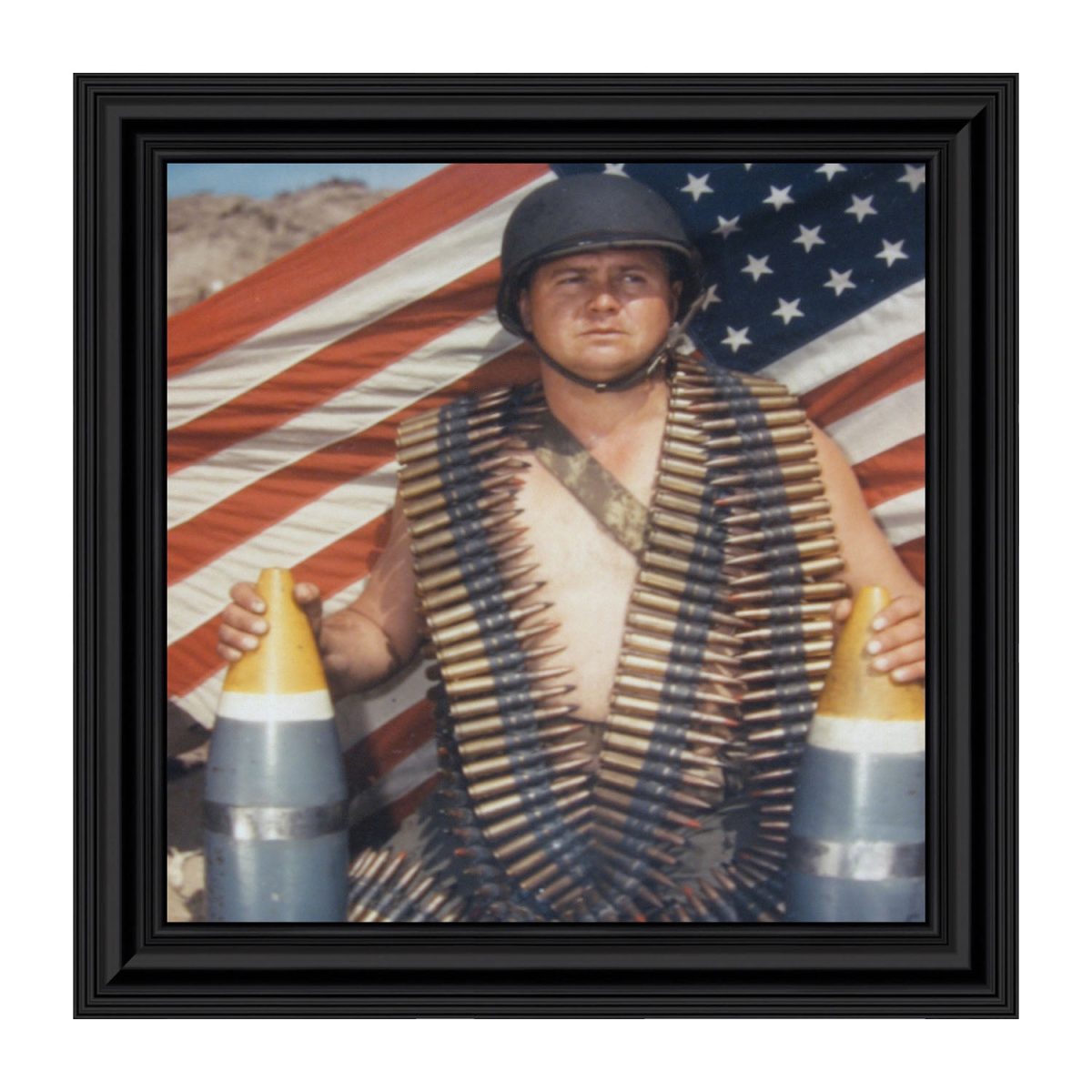 - A soldier draped with rifle bullets in front of an American flag. Military history.