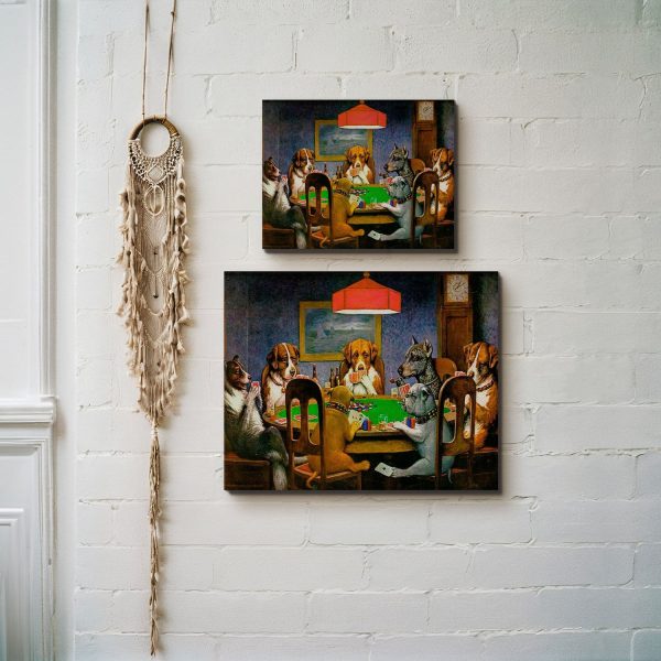 Our Dogs Playing Poker Canvas Print brings a unique blend of whimsy and style to your space. This iconic image, more than just a dogs playing cards scene, captures the playful essence of man’s best friend, making it an excellent choice for a fun yet sophisticated home decor piece.
