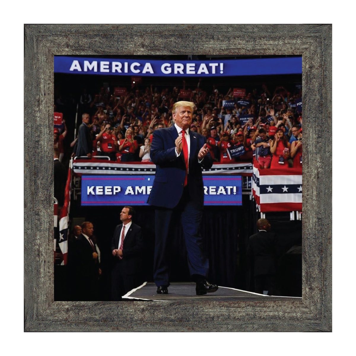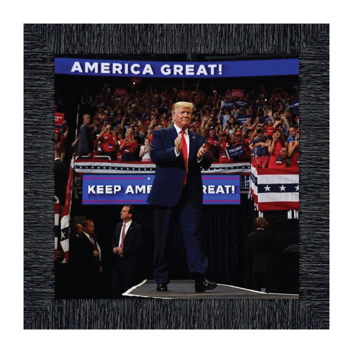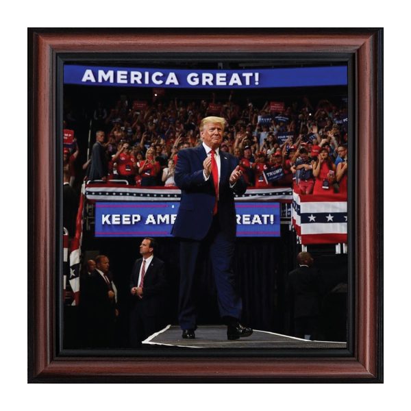 DONALD TRUMP WALKING OUT under his 2020 slogan “Keep American Great”. Framed picture displays a packed house of faithful Republicans who are excited for another rally by the president.