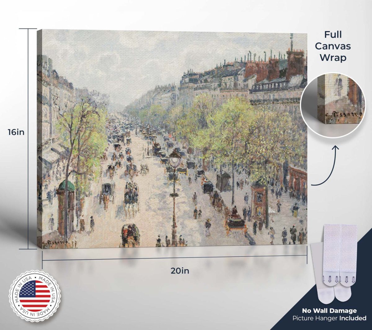 Our canvas print offers a unique window into the heart of Paris, as captured by Pissarro in his boulevard poster. This work of impressionist posters is a celebration of the city’s dynamic atmosphere, enriched by the delicate touch of fine art oil paintings, making it a must-have for lovers of Camille Pissarro and his legacy.