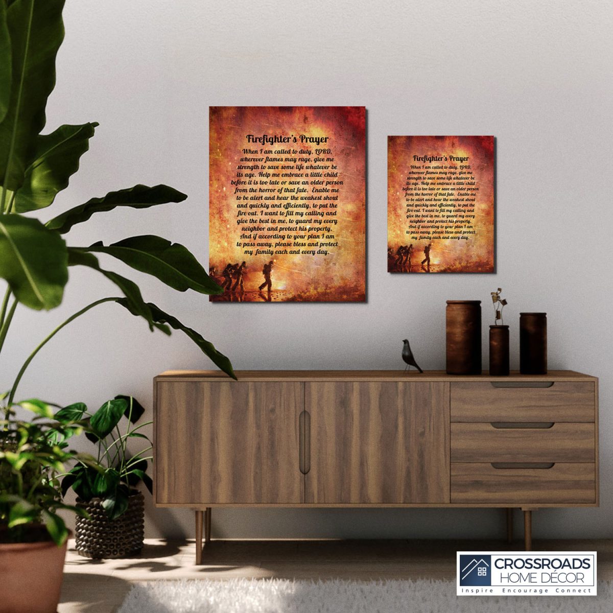 Looking for unique firefighter decor Our Firefighter Prayer Canvas Print is perfect for adding a touch of heroism to any space. This piece is not only visually stunning but also serves as a constant reminder of the courage and commitment of firefighters. Whether you’re decorating a living room or a fire station, this print enhances any firefighter wall decor collection.