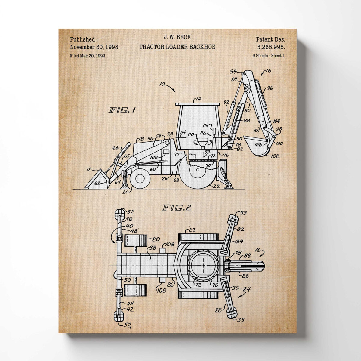 Gifts for Construction Workers, Backhoe Patent Canvas Print, Ready To Hang for Living Room Home Wall Decor, C2520