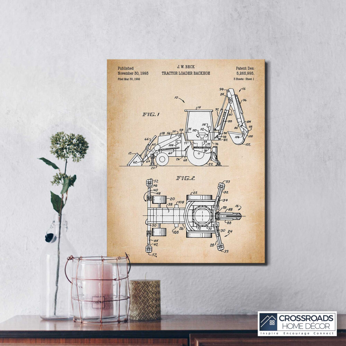Crossroads Home Décor, Gifts for Construction Workers, Backhoe Patent Canvas Print, Ready To Hang for Living Room Home Wall Decor