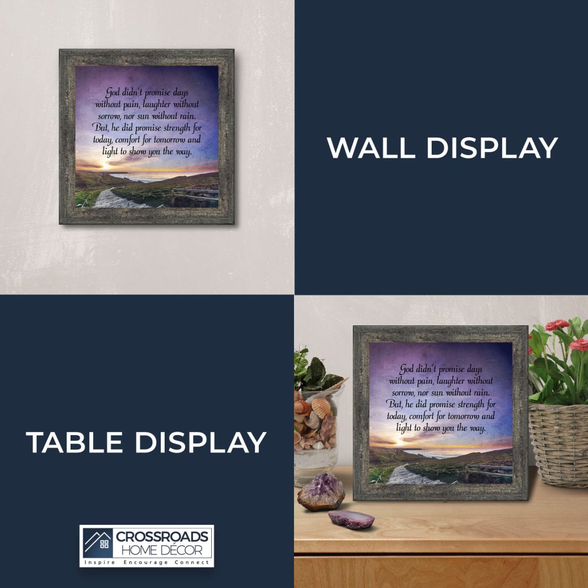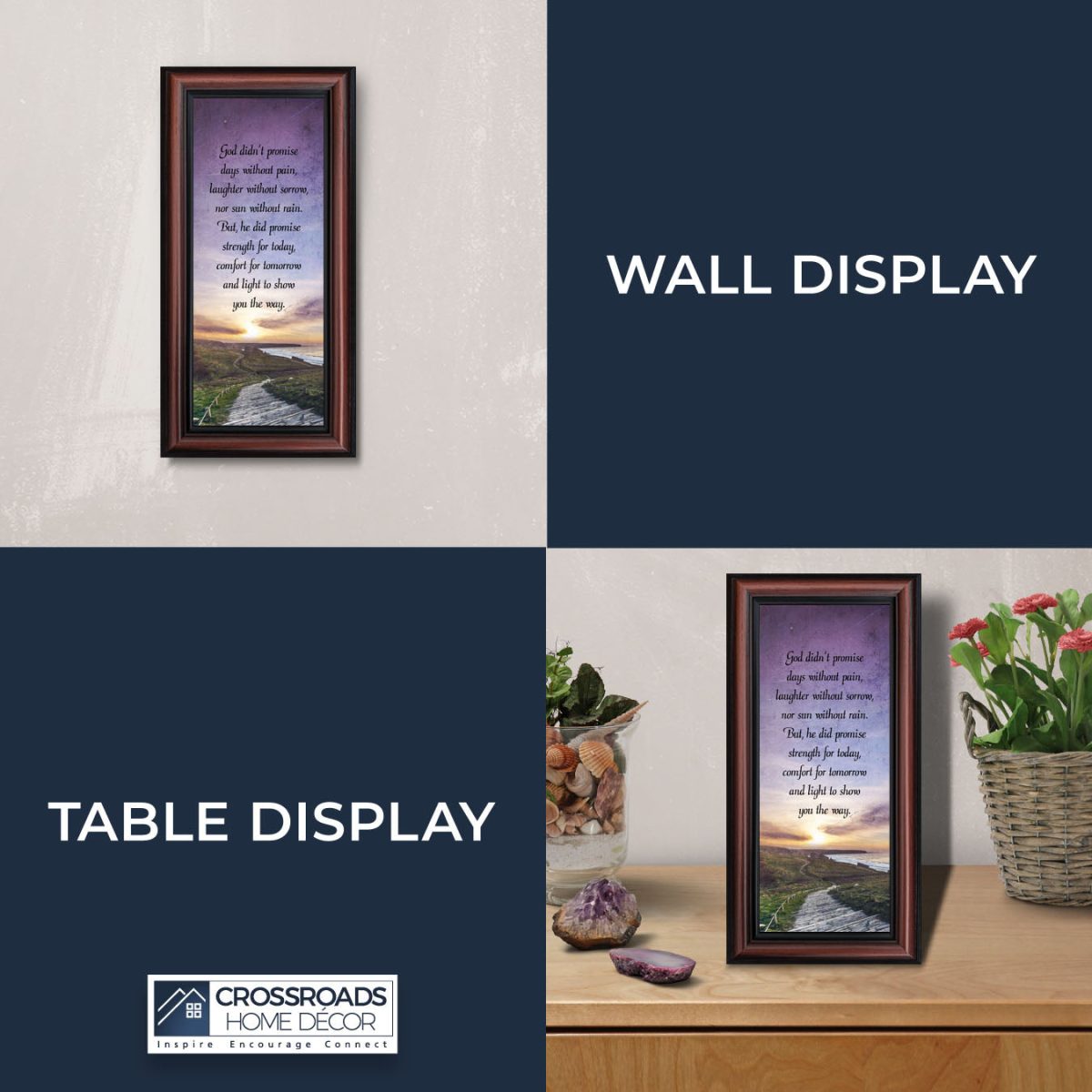 INSPIRE, ENCOURAGE and CONNECT with people to show you care. This inspirational work of art will give everyone who sees it an encouraging word for the day. Each frame is carefully packed and shipped to you or whomever you choose to ship it to. Every frame has an easel back that make for a quick easy display or a wall hanger for a more permanent decor solution. The front is real glass and will protect the print inside from fingerprints and dust. This beautiful, encouraging work of art will be cherished by your loved one for a lifetime.