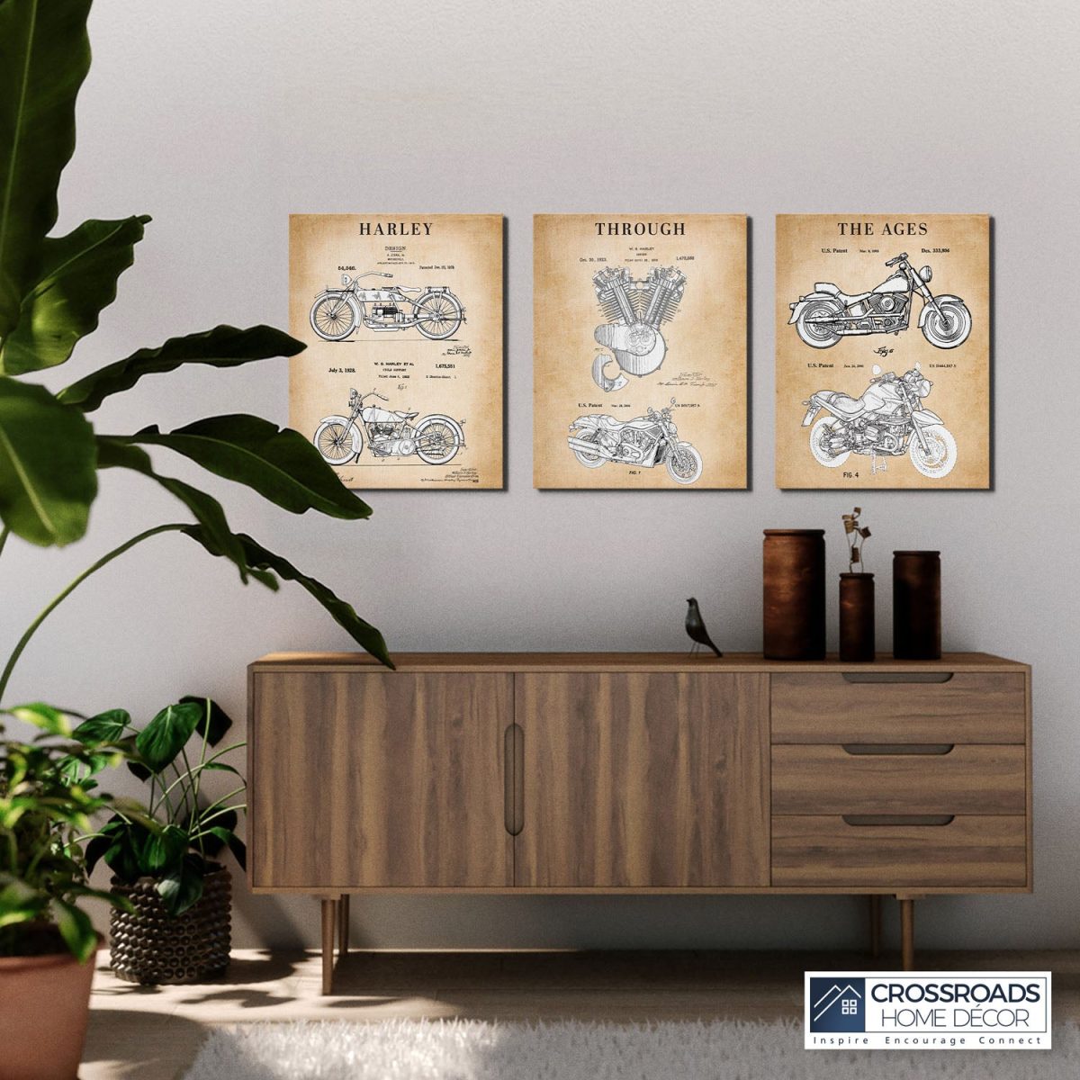 Transform your space with the rugged charm of our Harley Davidson Patent Canvas Print, an essential piece of Harley Davidson decor. This motorcycle wall art celebrates the engineering brilliance behind the brand, making it a captivating focal point in any room.