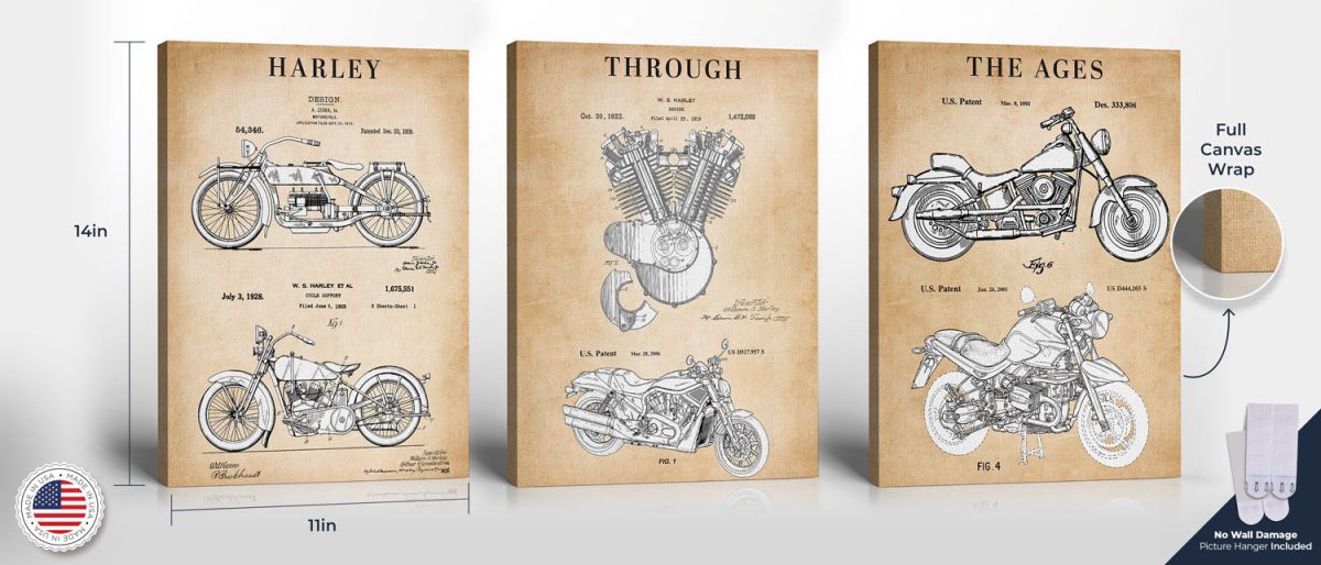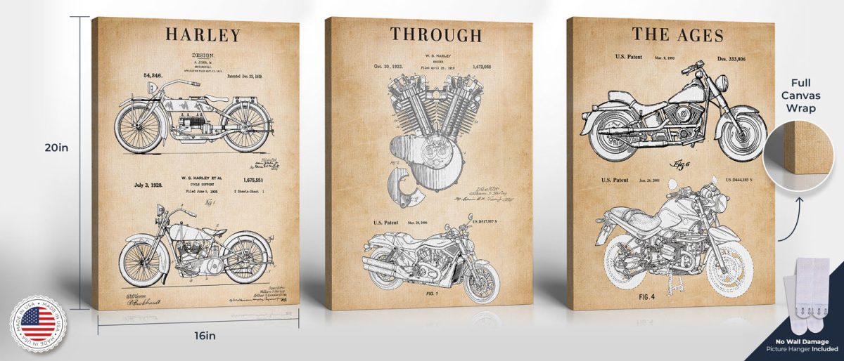 Our Harley Davidson Patent Canvas Print is a must-have for enthusiasts seeking unique Harley Davidson gifts for men. This piece of art captures the essence of iconic motorcycle innovation, making it a standout addition to any Harley Davidson decor.