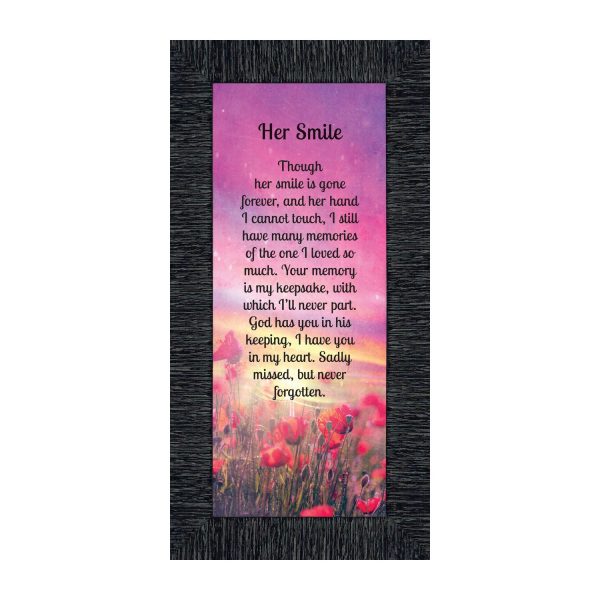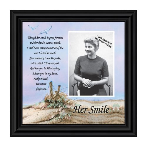 A UNIQUE SENTIMENTAL PICTURE FRAMEto have as a wedding memorial sign to show the importance of your mother, grandmother, sister or a woman who has passed away and had an influence on your life. Also, see our “His Smile” and “Your Smile” sympathy picture frames.