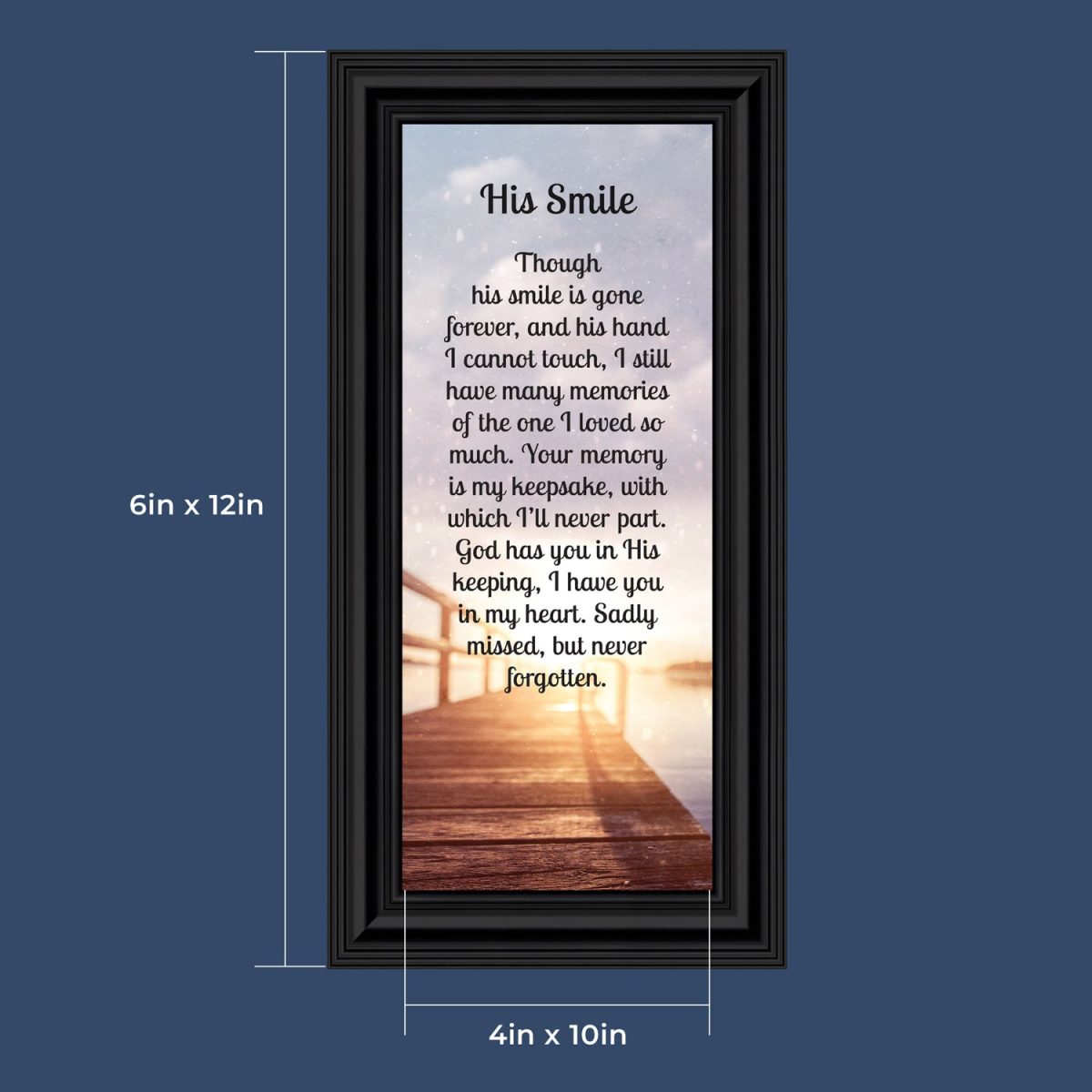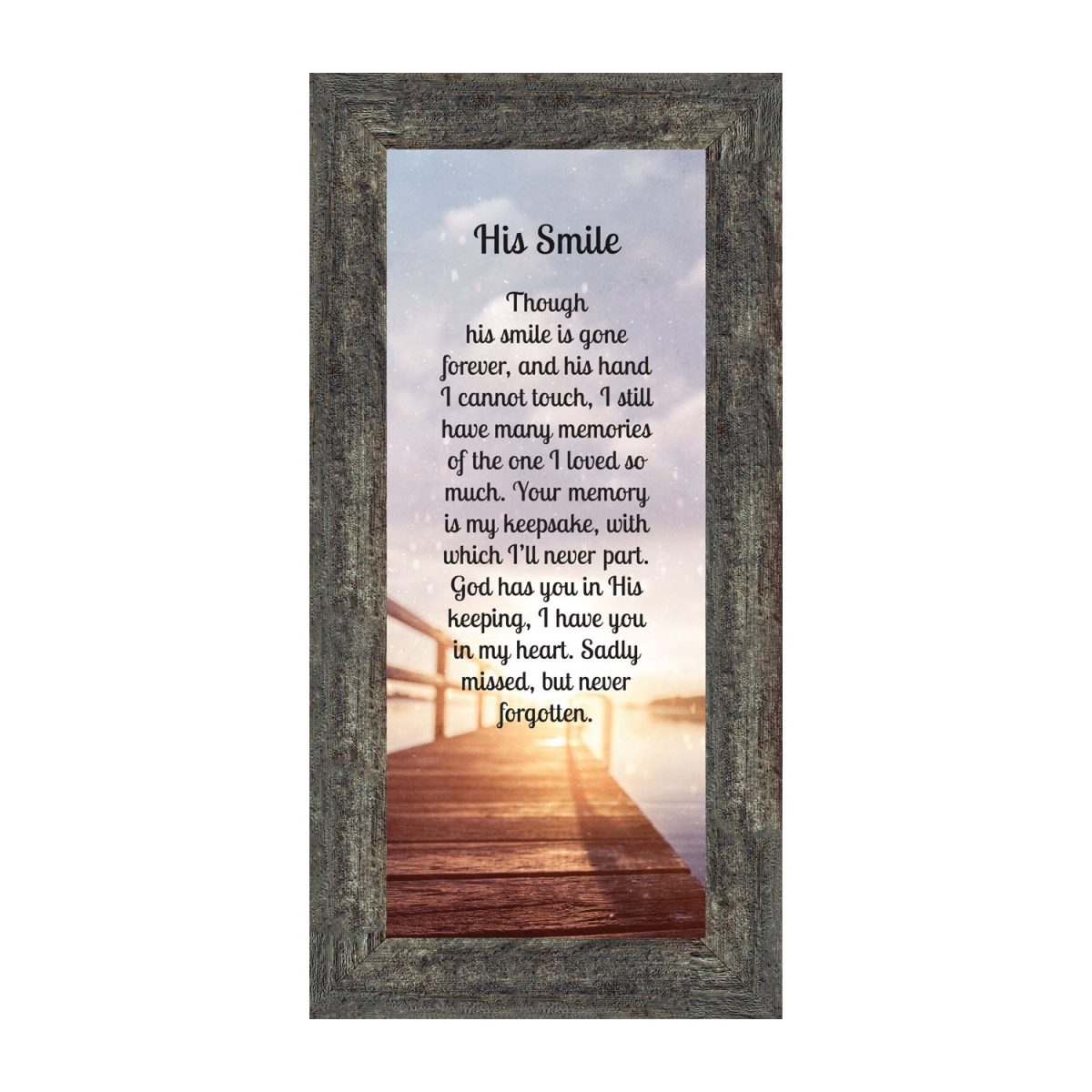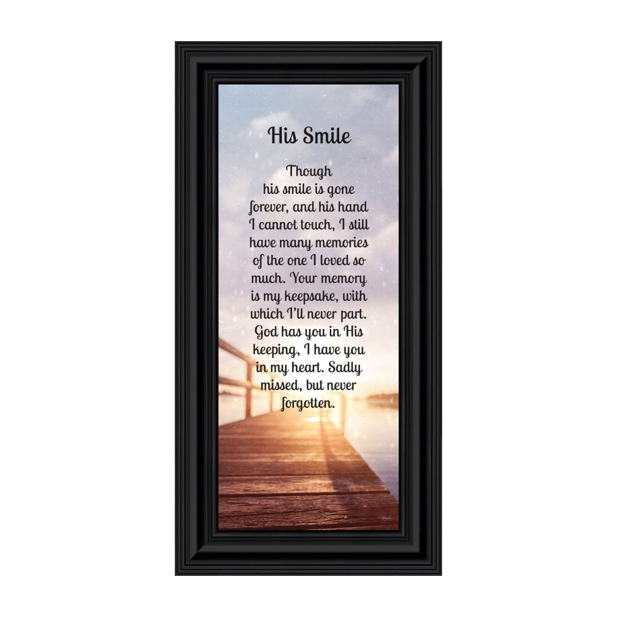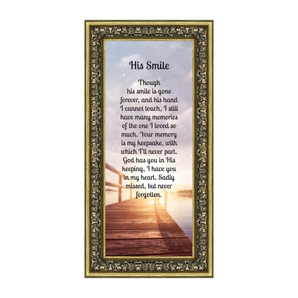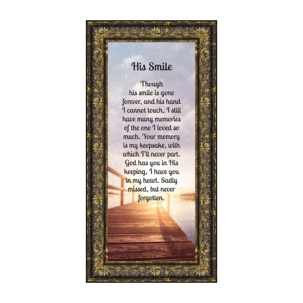 THIS MEN’S “HIS SMILE” SYMPATHY GIFT is crafted for those who are grieving the loss of a husband, father, grandfather, son, or male friend. See our “HER SMILE” sympathy gifts that honor a wife, mother, grandma, or daughter or a female friend. Each frame will capture the smile and spirit of the loved one who has passed away.