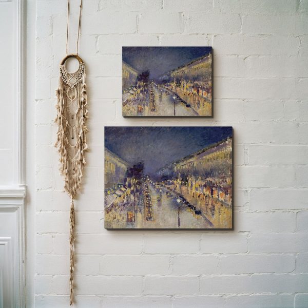Let the Boulevard Montmartre at Night canvas print transform your home into an art gallery. This impressionist wall art piece, inspired by Camille Pissarro, blends the vibrancy of Parisian life with the tranquility of night, making it an unparalleled addition to any collection of fine art prints or famous paintings.