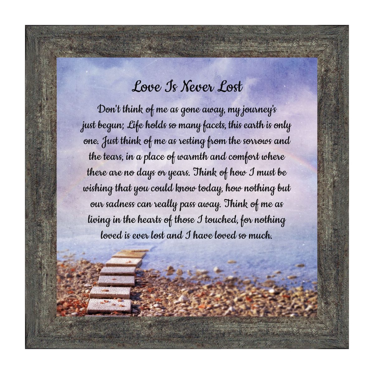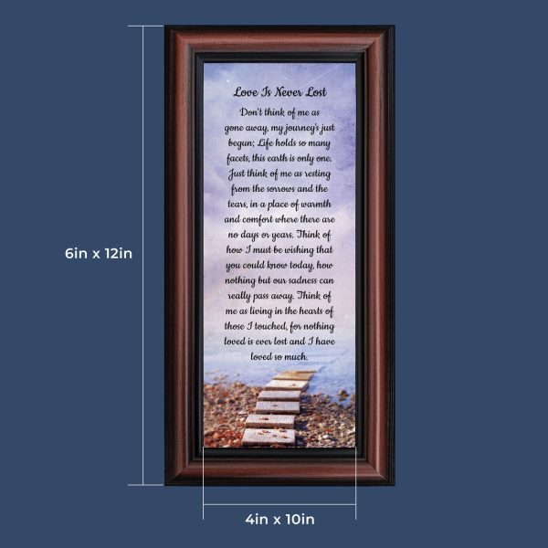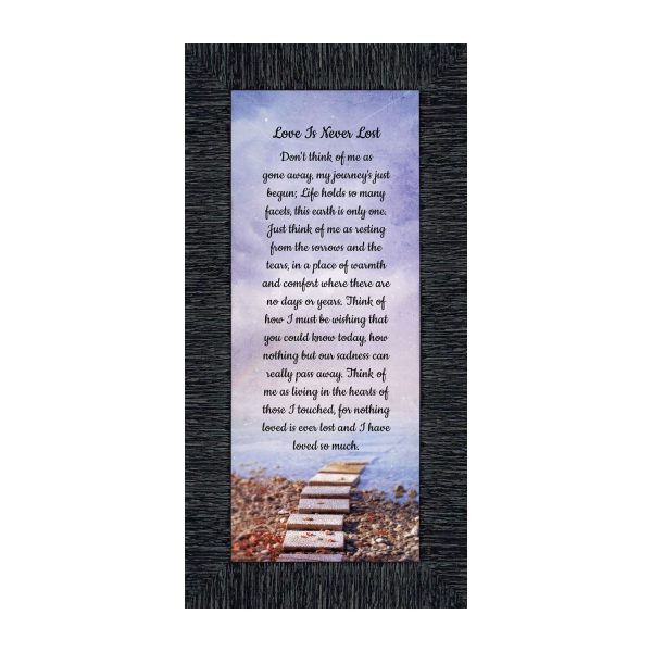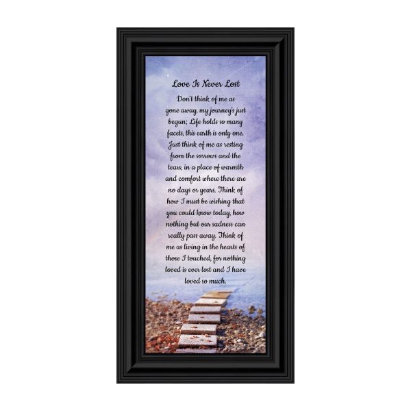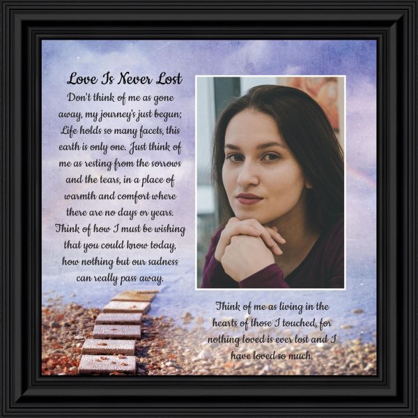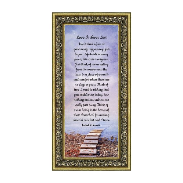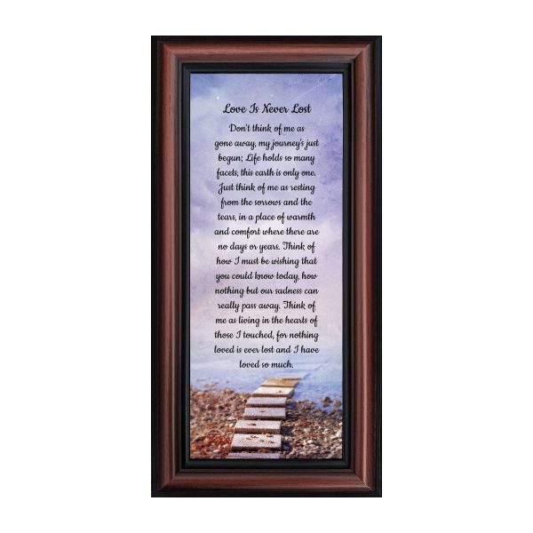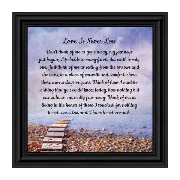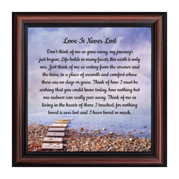 BEAUTIFUL MEMORIAL GIFTS for loss of mother or sentimental memorial gifts for loss of father. A very special sympathy gift for anyone who has lost someone they love. The words in the “Love is Never Lost” poem are a powerful daily reminder of a loved one who has passed away. The healing words will bring comfort and peace to those who are grieving. Add the frame to your sympathy gift baskets or sympathy card for a truly meaningful “thinking of you” gift.