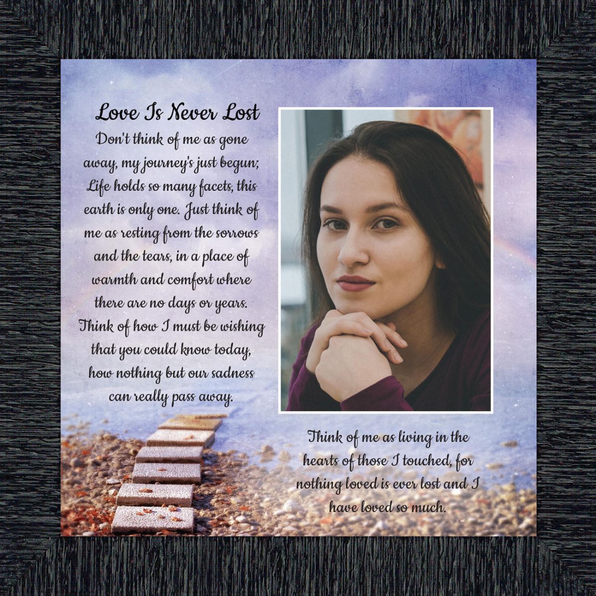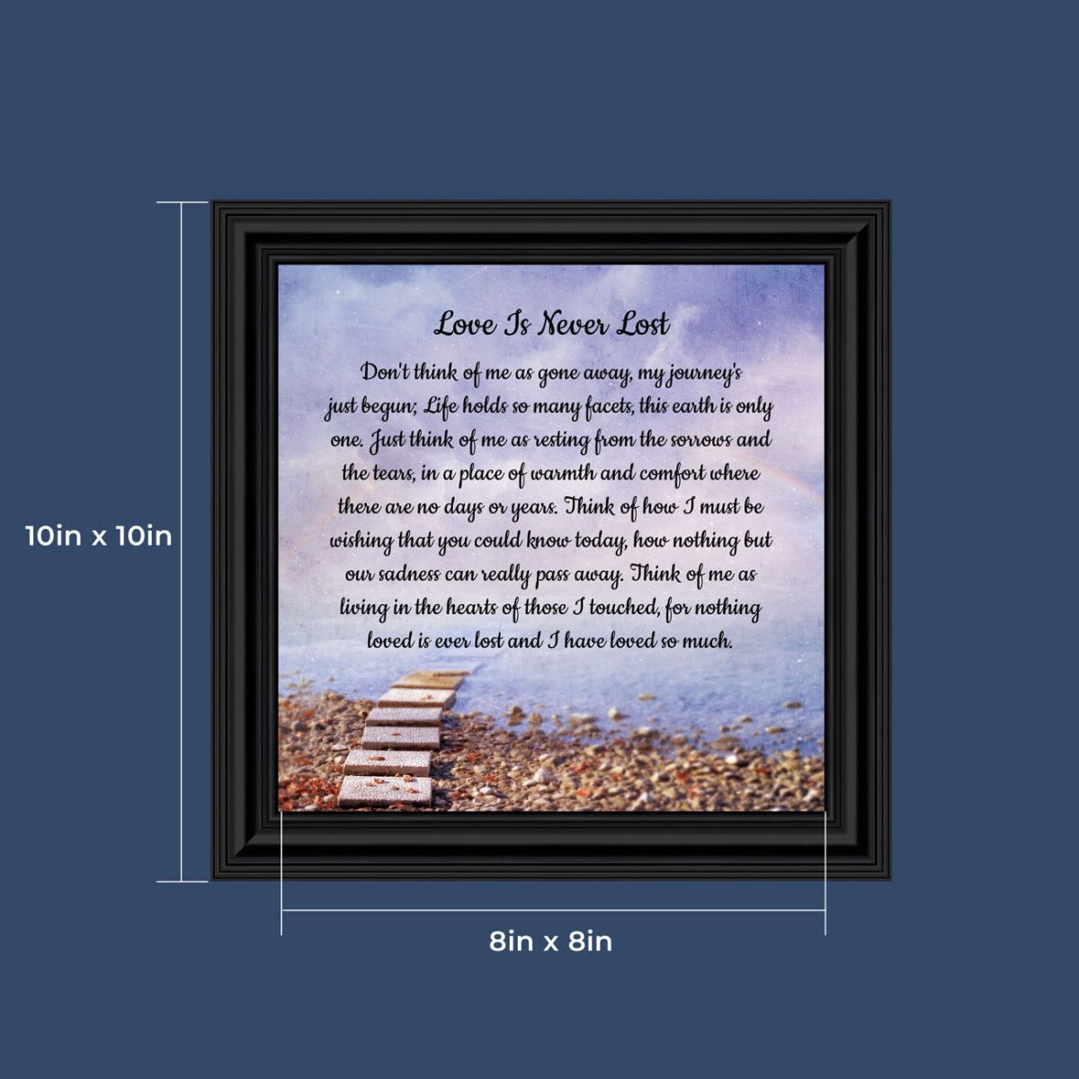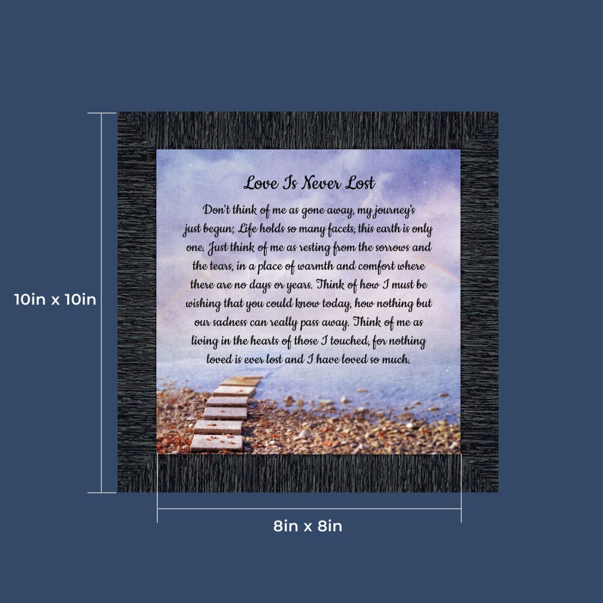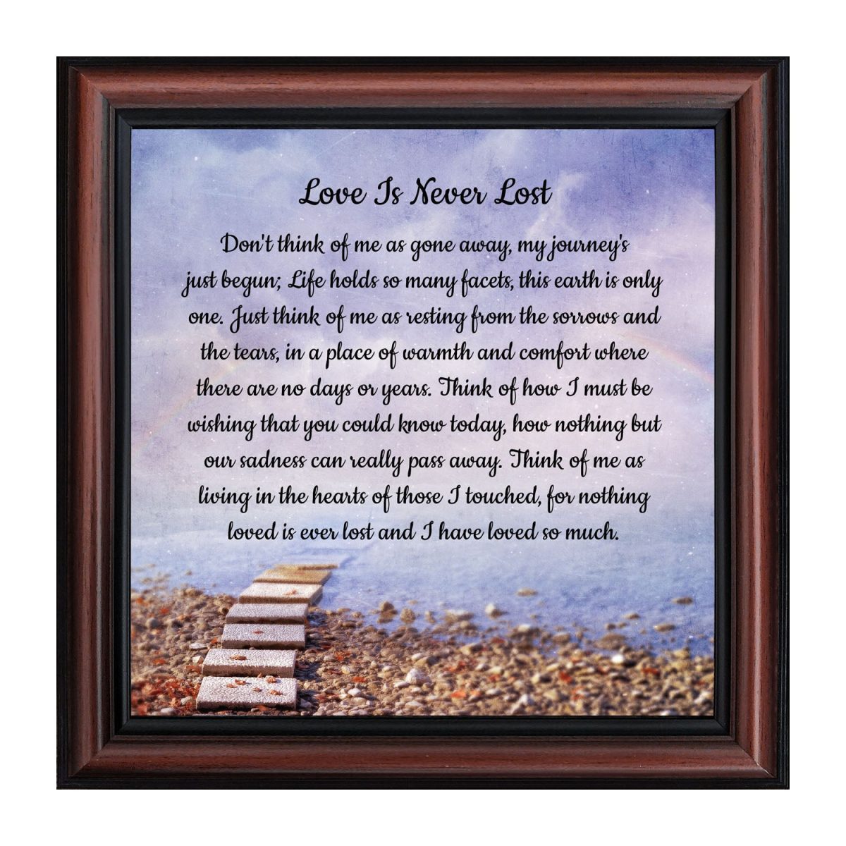 BEAUTIFUL MEMORIAL GIFTS for loss of mother or sentimental memorial gifts for loss of father. A very special sympathy gift for anyone who has lost someone they love. The words in the “Love is Never Lost” poem are a powerful daily reminder of a loved one who has passed away. The healing words will bring comfort and peace to those who are grieving. Add the frame to your sympathy gift baskets or sympathy card for a truly meaningful “thinking of you” gift.