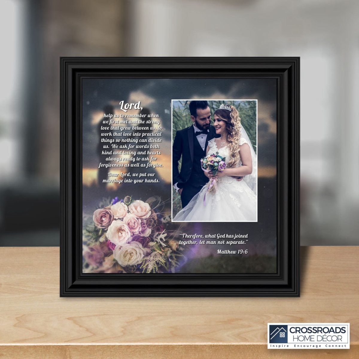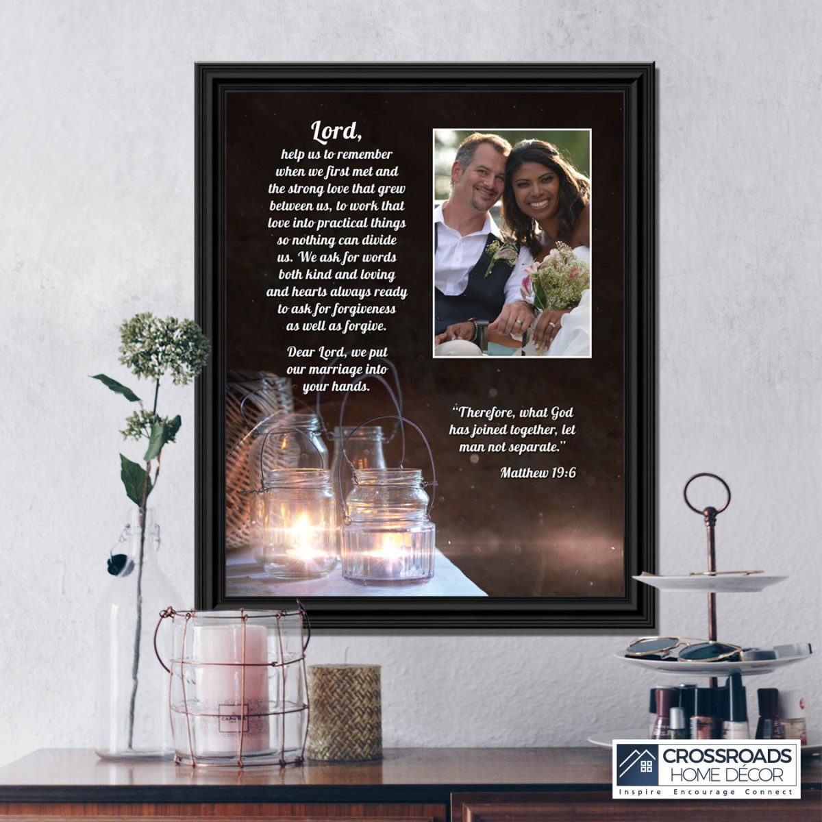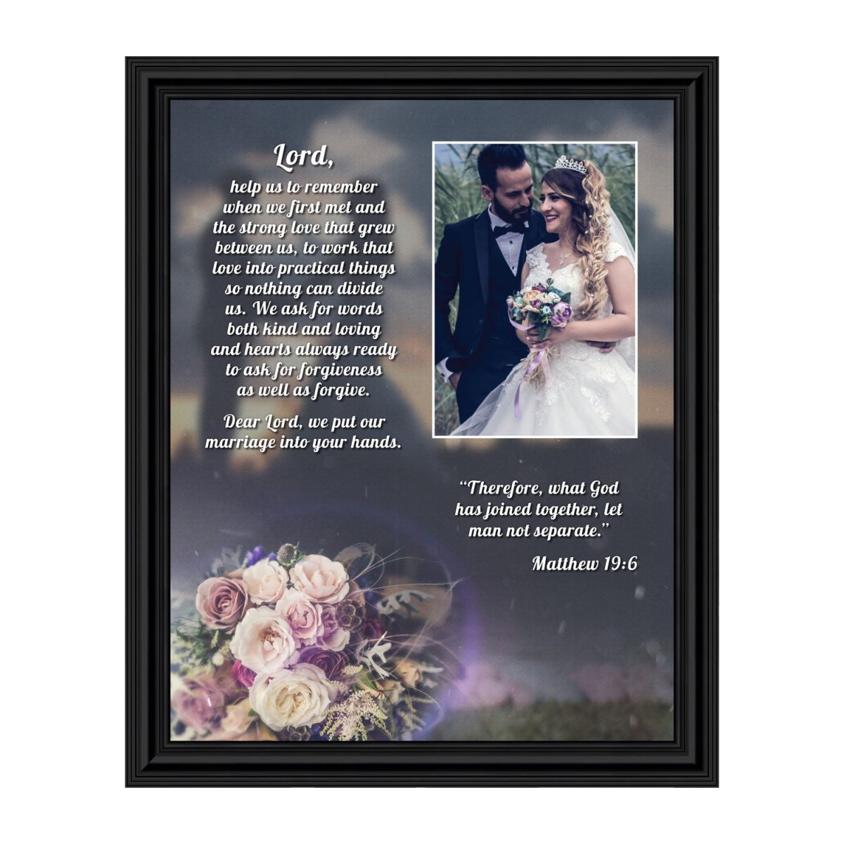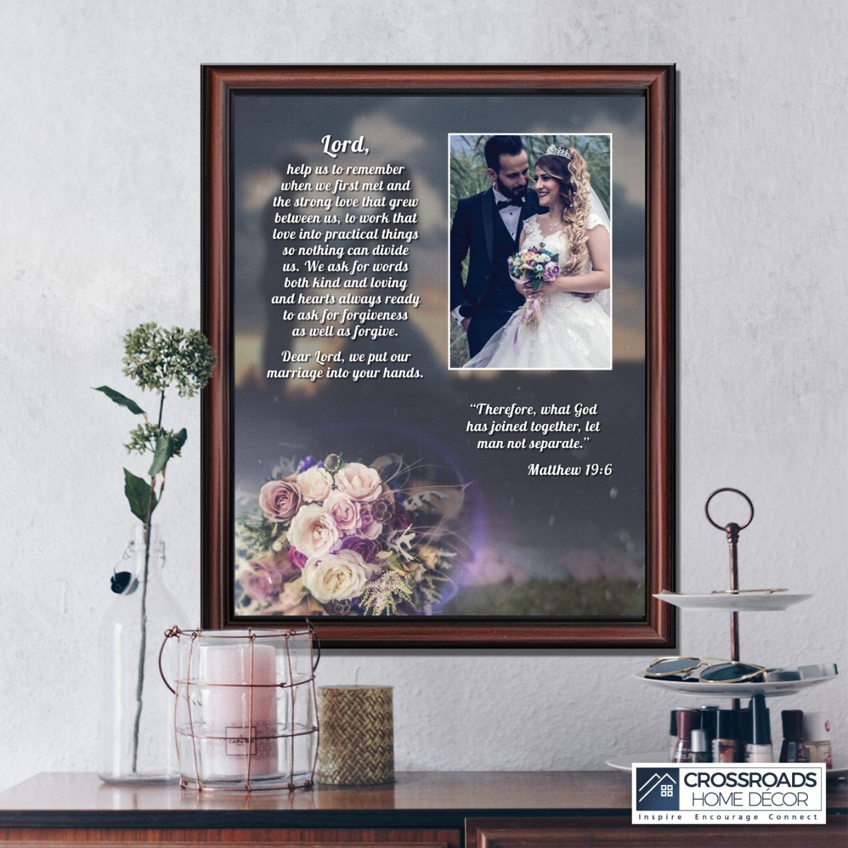 THIS IS A WEDDING GIFT FILLED WITH MEANING and important reminders for any couple. This prayer and Matthew 19:6 scripture will be a daily reminder of the Lord’s blessing upon this marriage. Whether you are looking for a bridal shower gift, an anniversary gift for a special couple or romantic gifts for her, this scripture wall art will show how much you care.