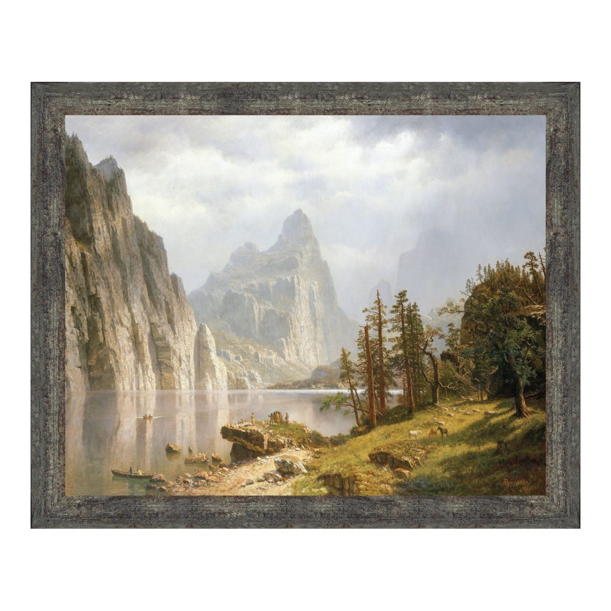 ENJOY THE MAJESTIC BEAUTY OF YOSEMITE as Albert Bierstadt captures the sunlight off of the regal mountains besides the Merced River. The print would make a great framed wall art for living room.