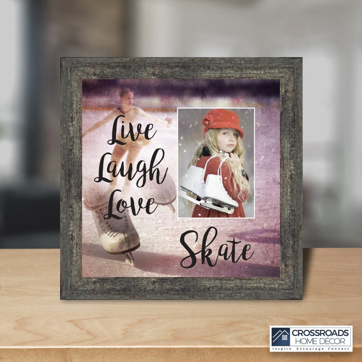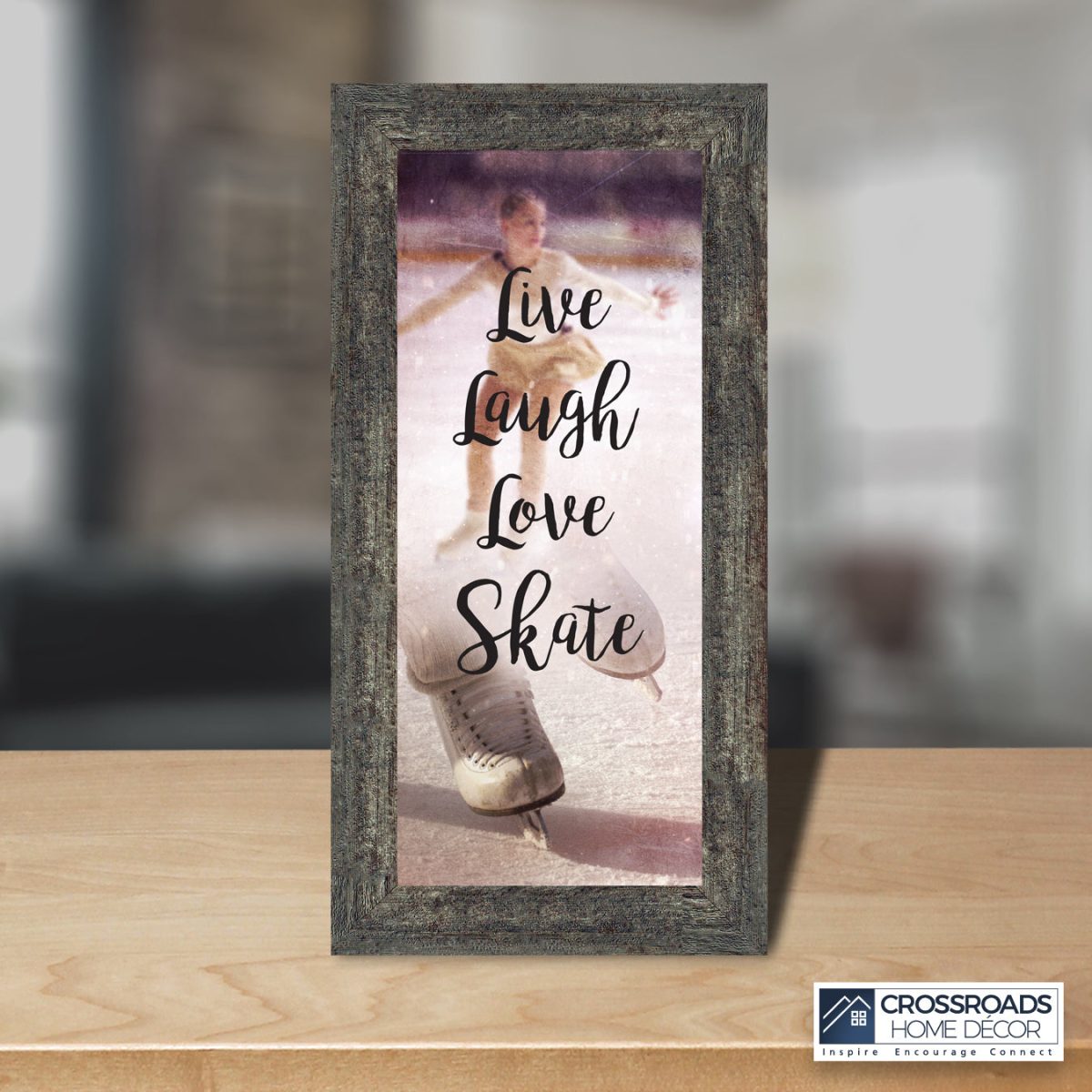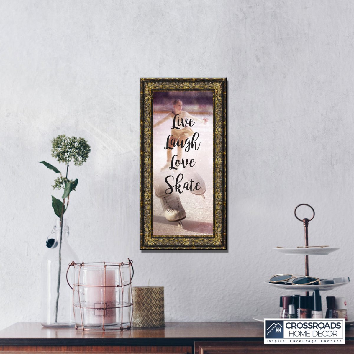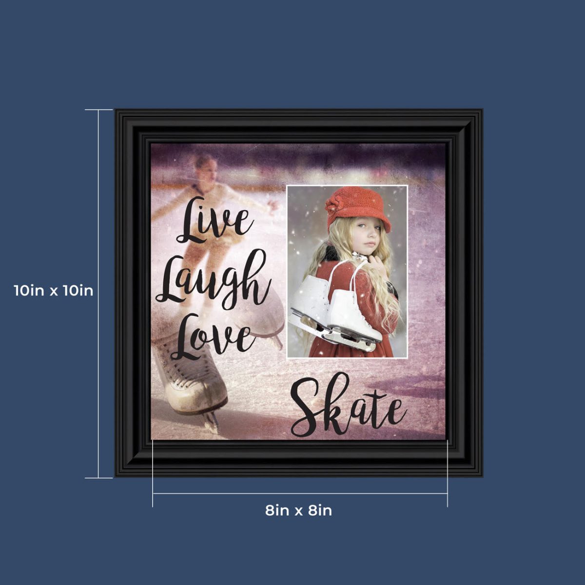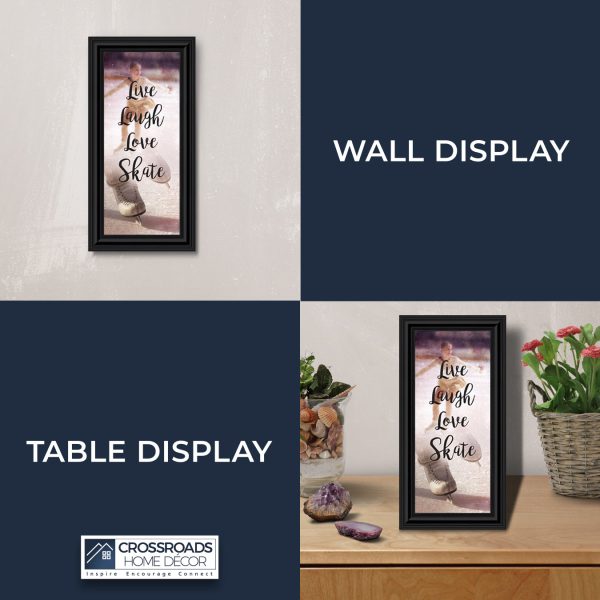 - Picture framed ice skating themed photo with the quote “Live, Laugh, Love. Skate”.