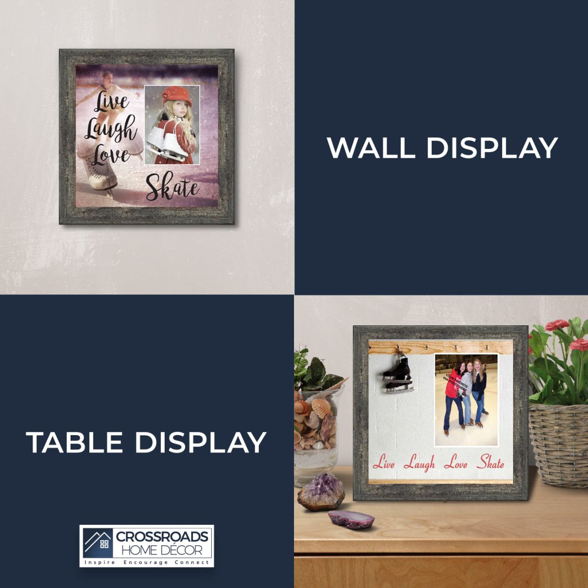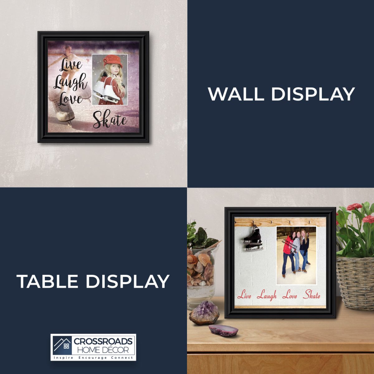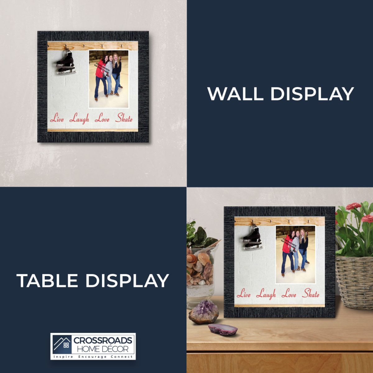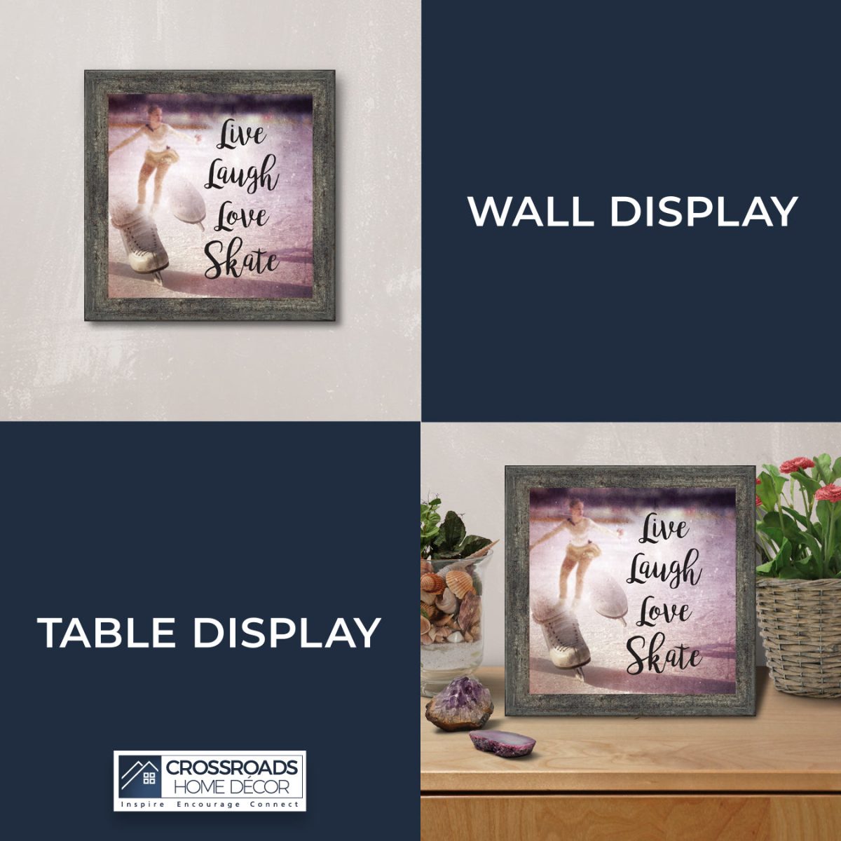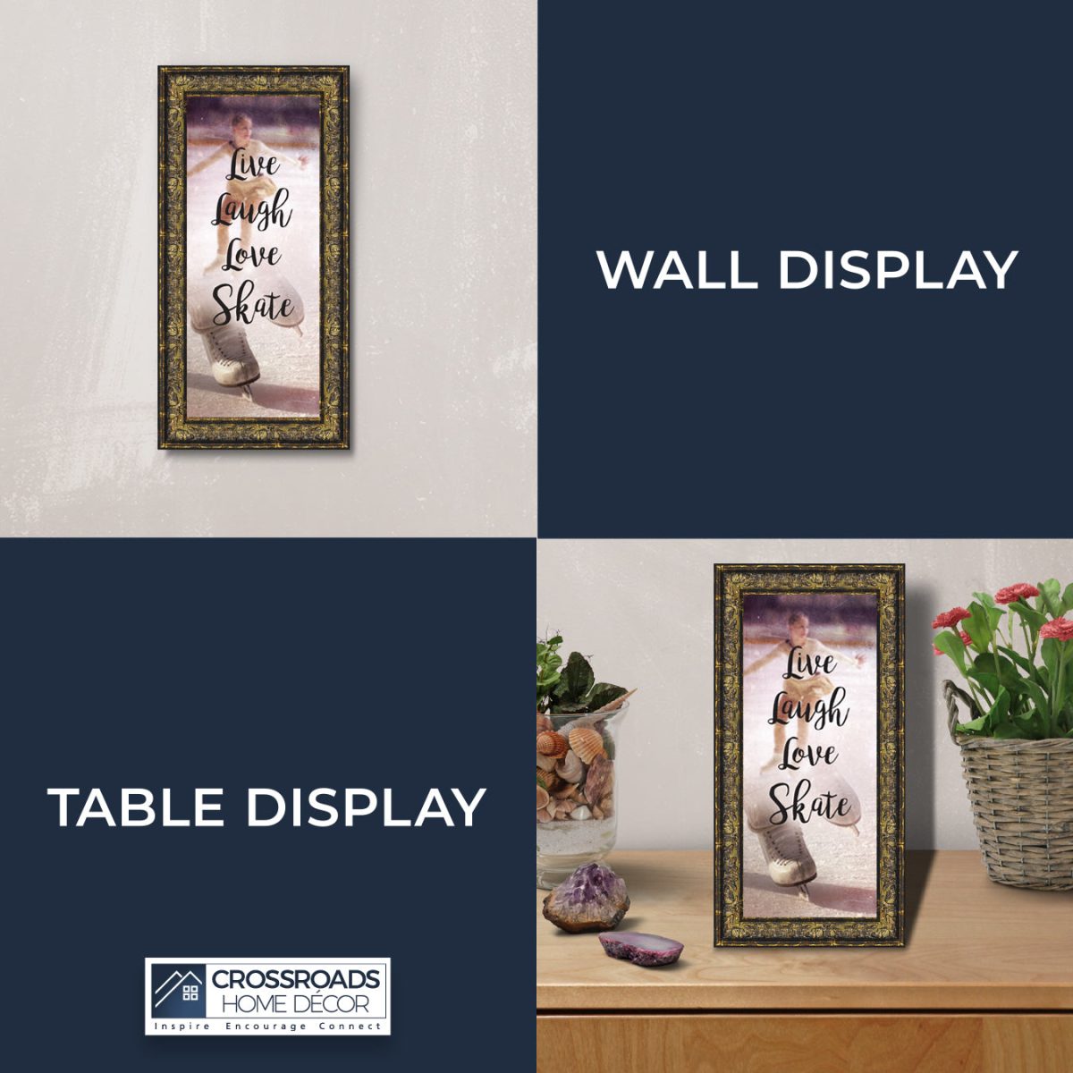 - Picture framed ice skating themed photo with the quote “Live, Laugh, Love. Skate”.