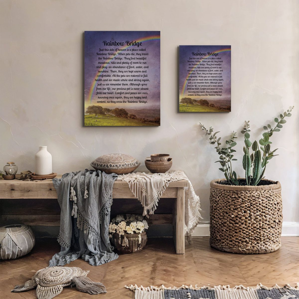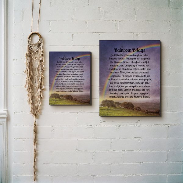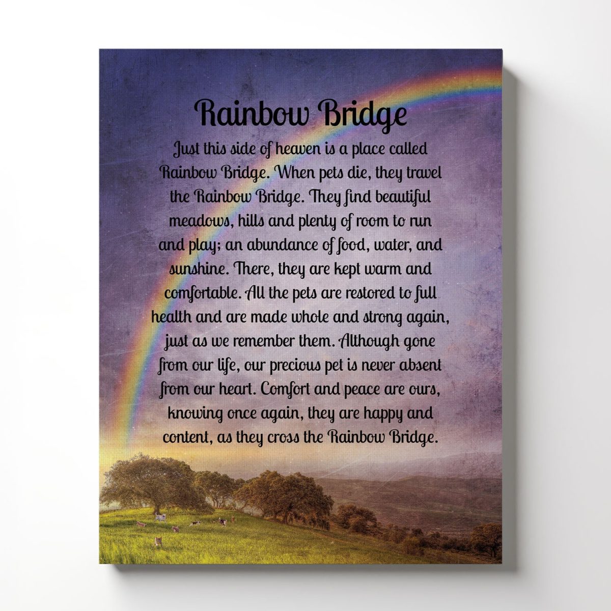 Keep the memory of your beloved pet alive with our rainbow bridge poem canvas print. This artwork embodies the heartfelt journey to a place of eternal happiness, serving as a consoling rainbow bridge picture for those mourning their cherished companion.