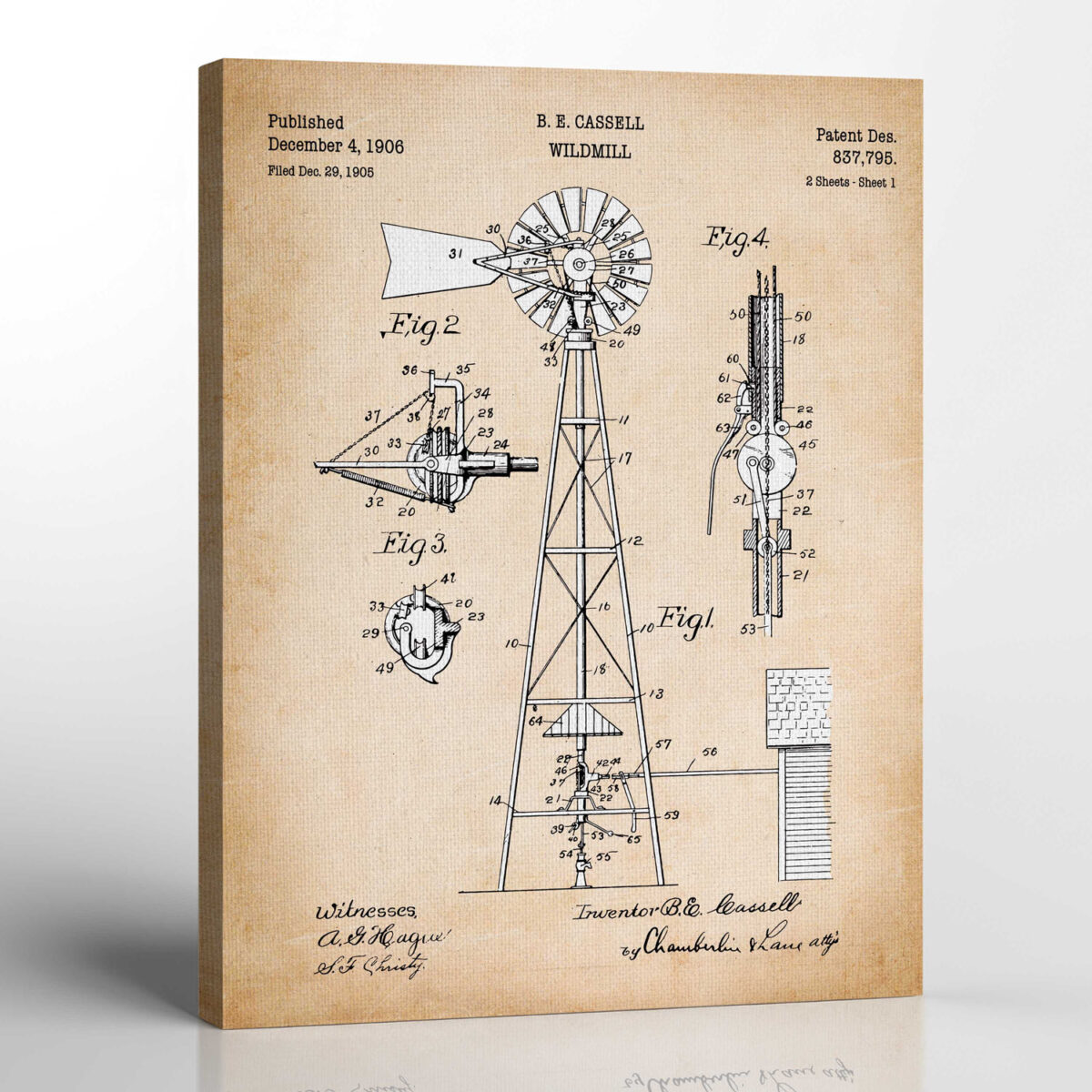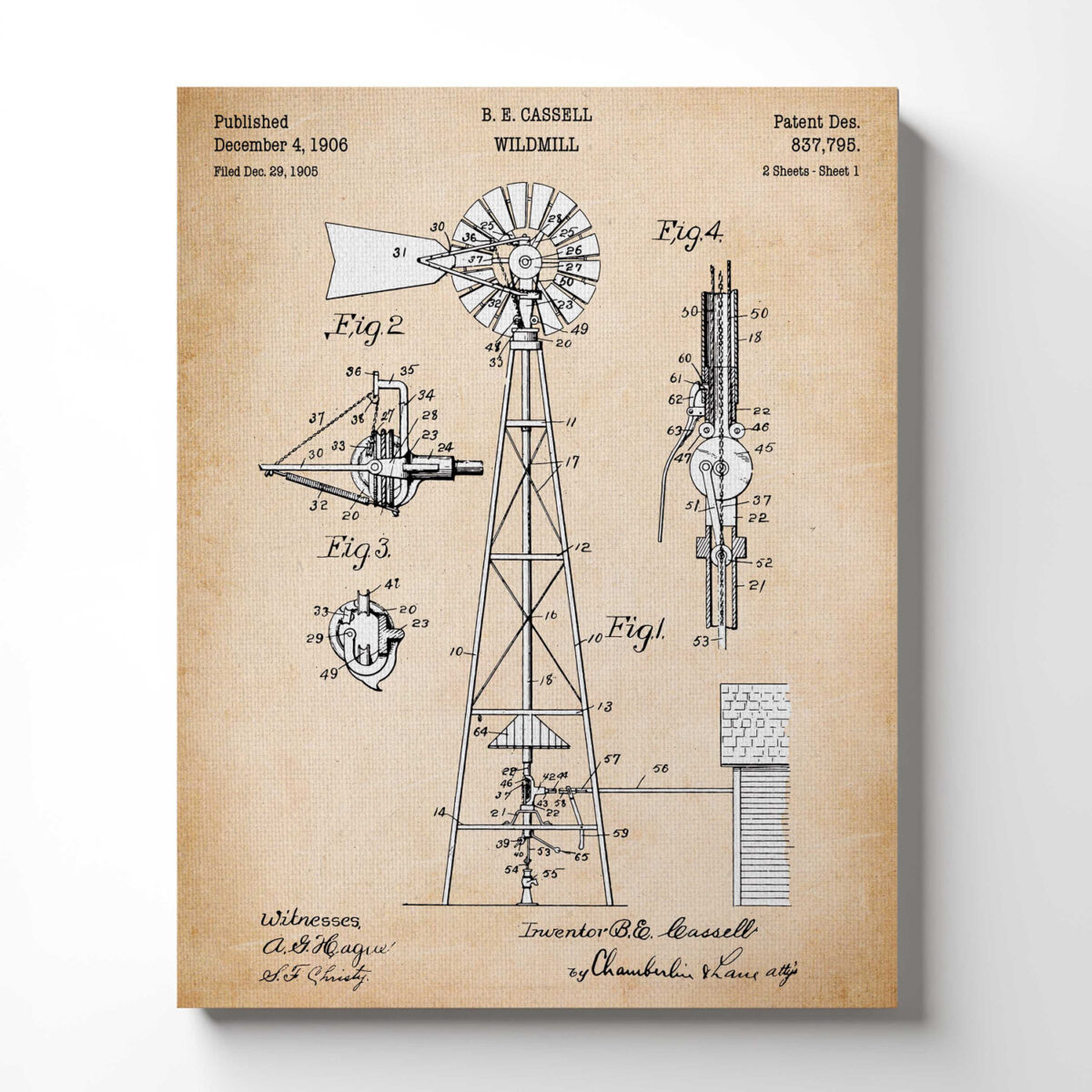 Rustic Home Decor, Farmhouse Wall Decor, Windmill Patent Canvas Print, Ready To Hang for Living Room Home Wall Decor, C2541