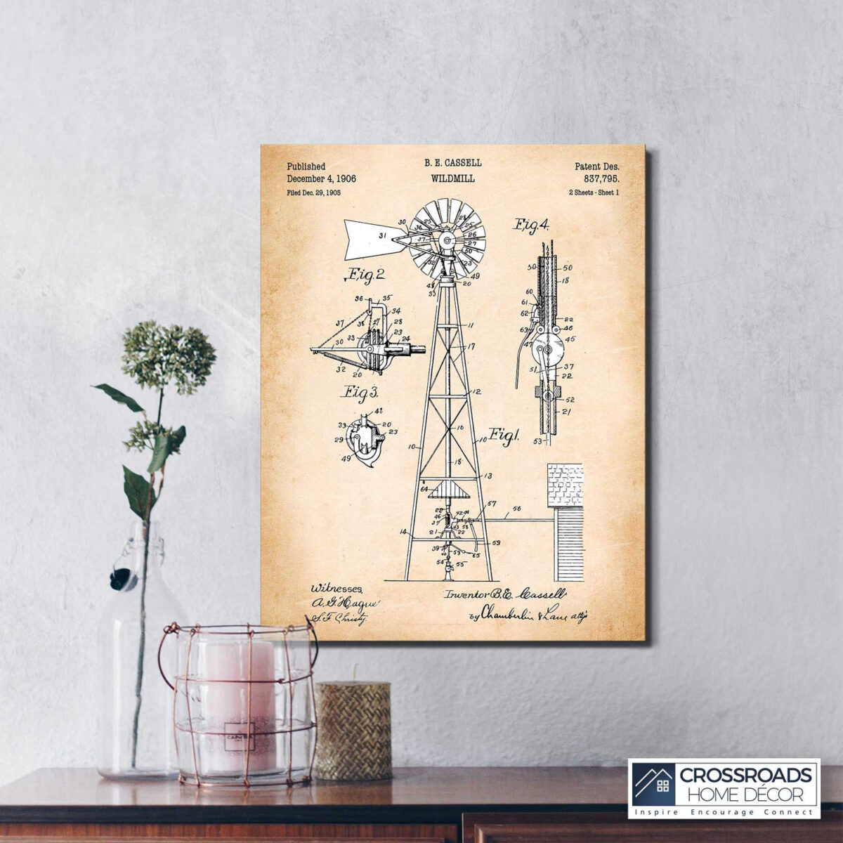 Crossroads Home Décor, Rustic Home Decor, Farmhouse Wall Decor, Windmill Patent Canvas Print, Ready To Hang for Living Room Home Wall Decor