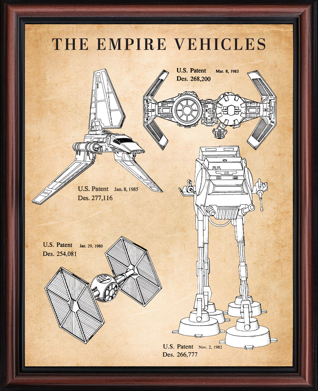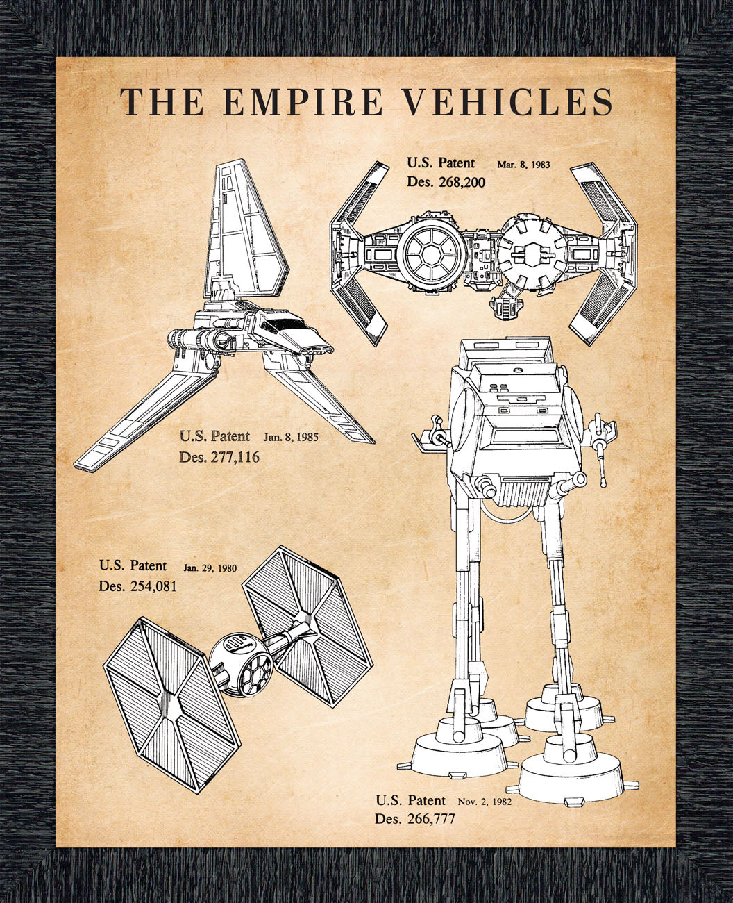 PATENT PRINT OF TIE FIGHTER, Tie Bomber and Imperial Shuttle and AT-AT all in one frame. This Set will make a great displace from your living room, man cave, office or home office decor.