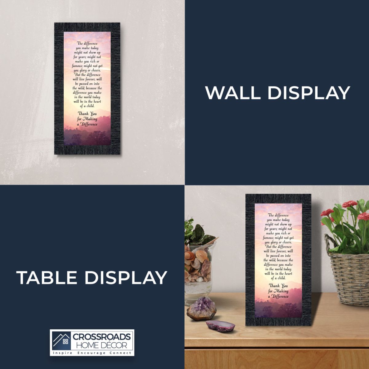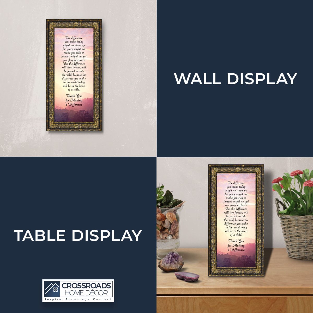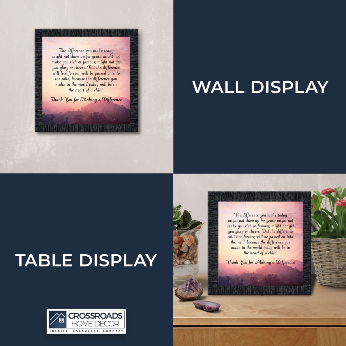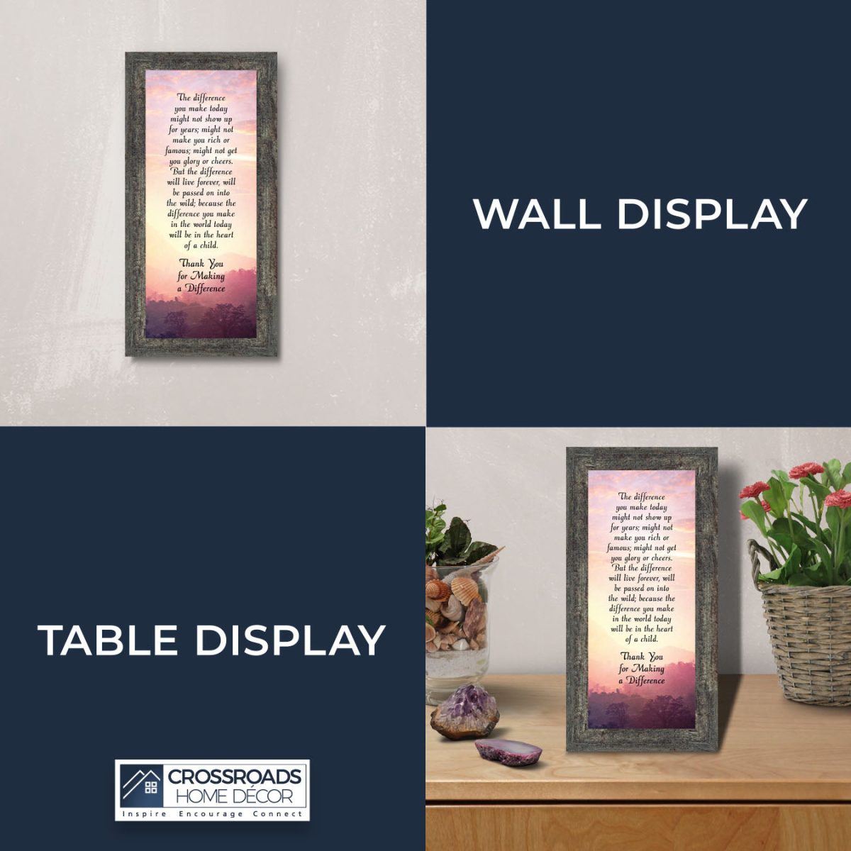 INSPIRE, ENCOURAGE and CONNECT with people to show you care. This inspirational work of art will give all who see it as an encouraging word for the day. Each frame is carefully packed and shipped to you or whomever you choose to ship it to. Every frame has an easel back that makes for a quick easy display (except for the 11×14) or a wall hanger for a more permanent decor solution. The front is real glass and will protect the print inside from fingerprints and dust. This beautiful, encouraging work of art will be cherished by your loved one for a lifetime.