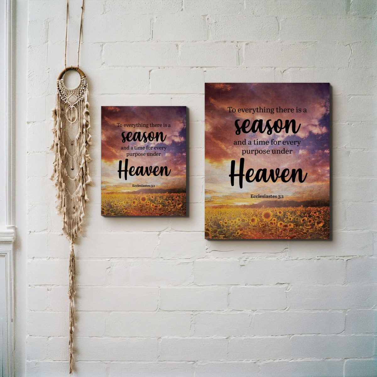 Let the Everything a Season Ecclesiastes 3:1 Canvas Print transform your environment. This artwork, illustrating the phrase to every thing there is a season, complements any sunflower canvas collection and brings a touch of natures beauty into your home, perfect for creating a serene room decor aesthetic.