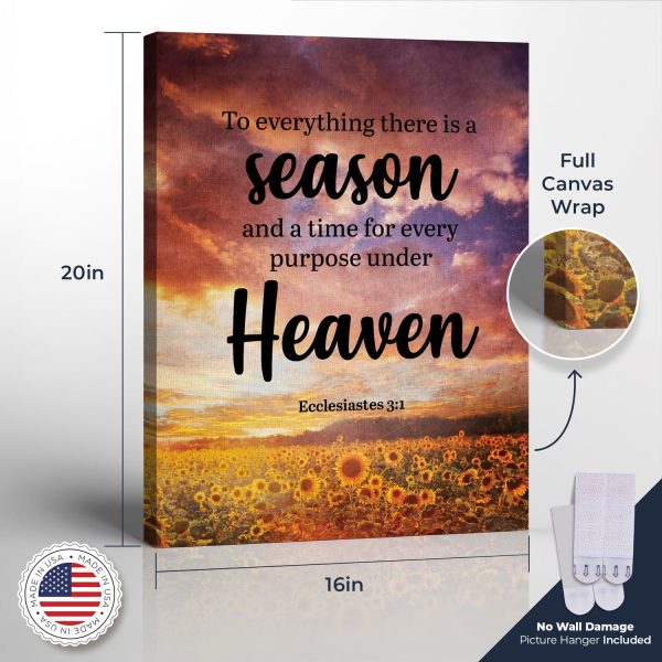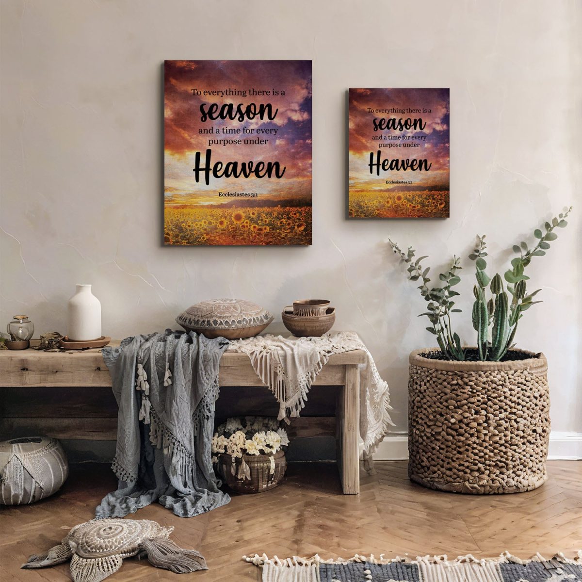 Enhance your living area with the Everything a Season Ecclesiastes 3:1 Canvas Print, an exquisite piece of sunflower canvas wall art. This canvas, celebrating the timeless wisdom of Ecclesiastes, integrates beautifully with living room decor, offering both comfort and style.