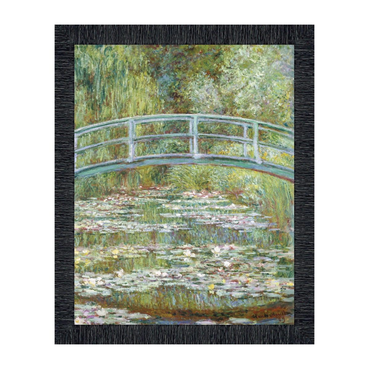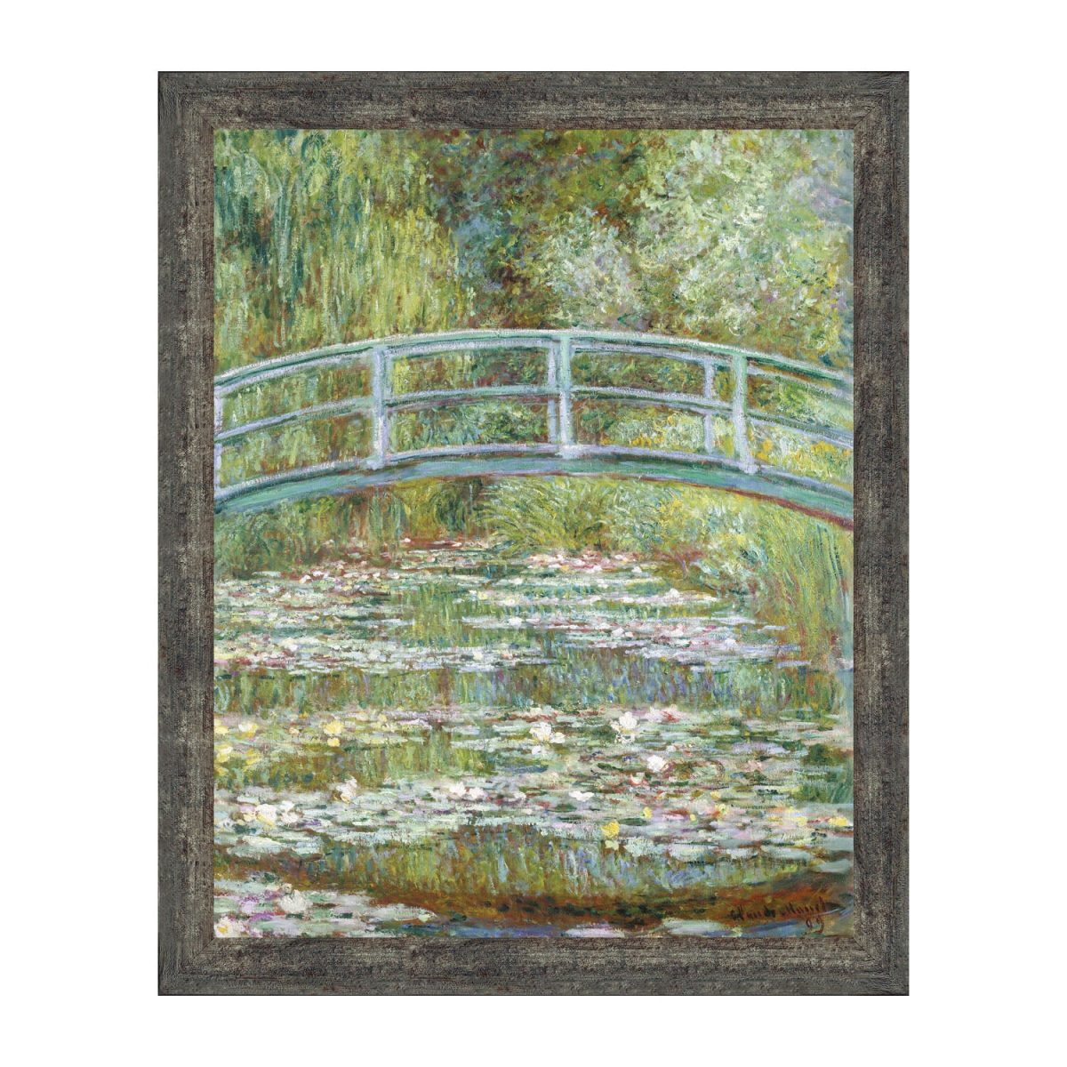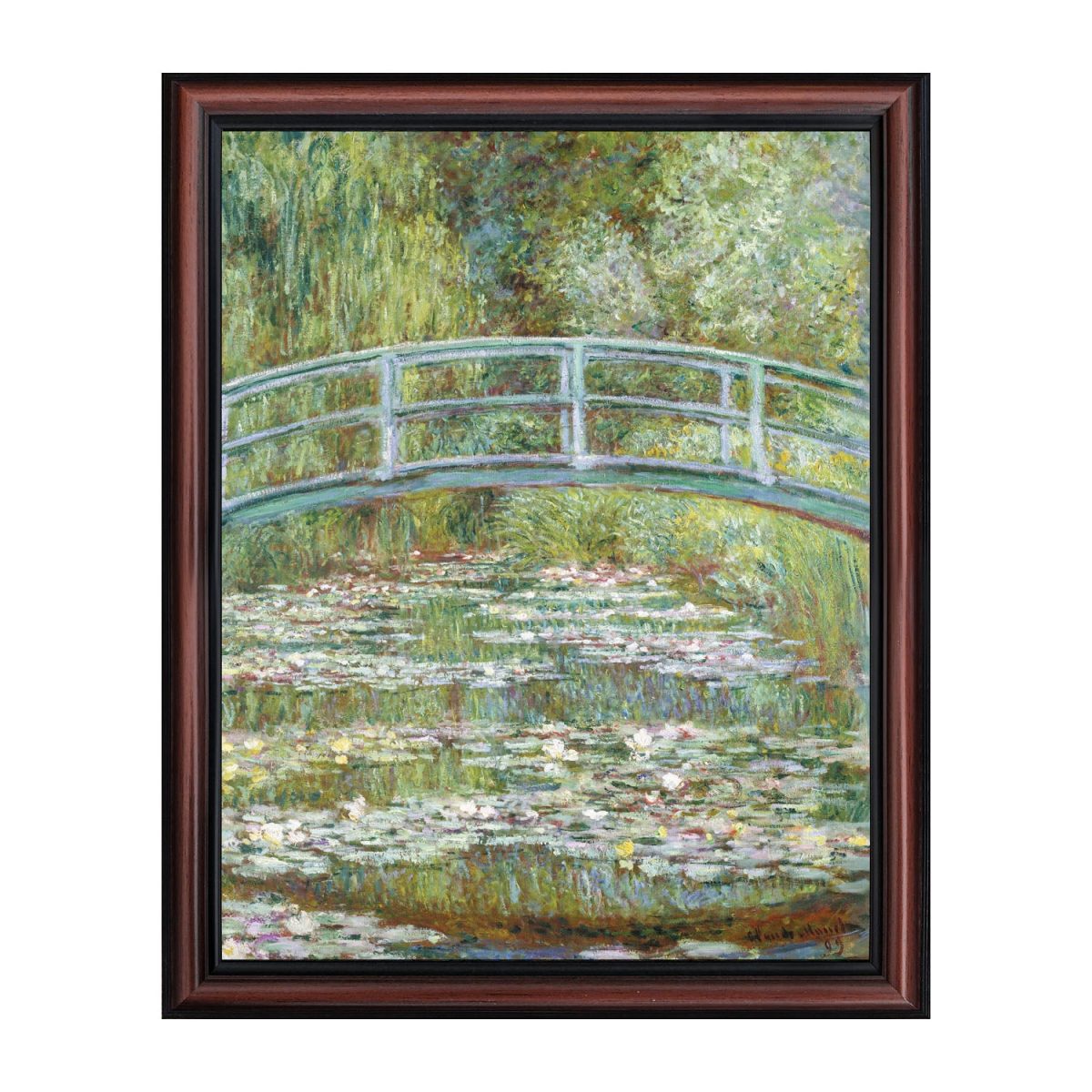 MONET WATER LILLIES PRINT shows an arched bridge over a reflecting pond of covered in water lilies. Green, teal with splashes of red, yellow and white will blend well with living room, kitchen or office decor.